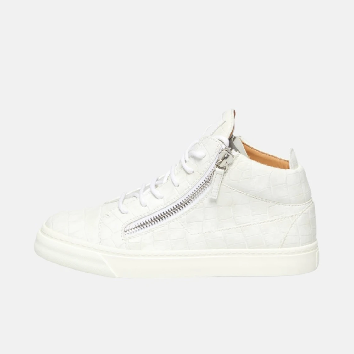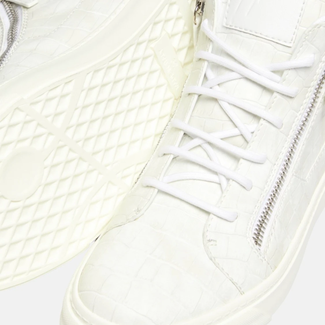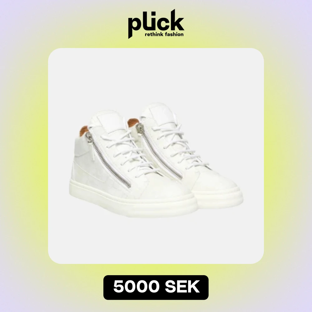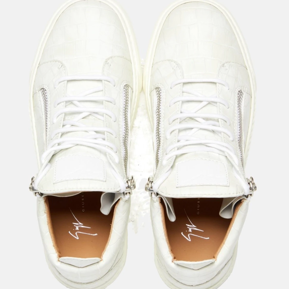Säljer ett par snygga vita giuseppe zanotti skor i skinn med coola dragkedjor på sidorna. De har en högre modell med snörning och en stilren design. Perfekta för både vardag och fest!