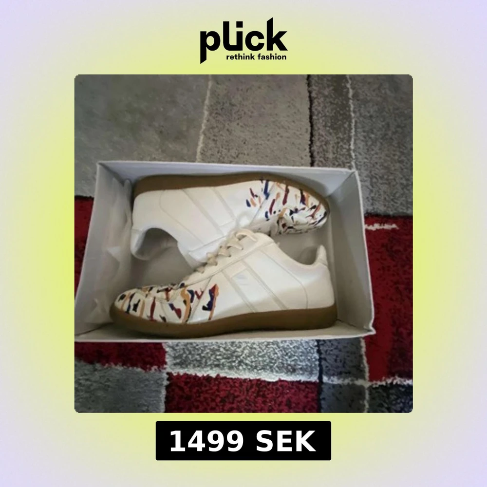 Säljer ett par vita sneakers med färgglatt camouflagemönster i blått, rött och beige på tån och sidorna. Skorna har vita snören och en brun sula. Perfekta för dig som vill sticka ut med din stil.