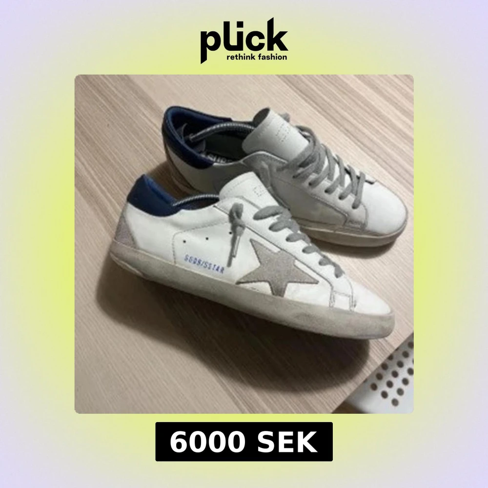 Snygga vita sneakers från Golden Goose med en grå stjärna på sidan och grå snörning. Skorna har en mörkblå häl och en vintage-inspirerad look. Perfekta för en avslappnad stil.