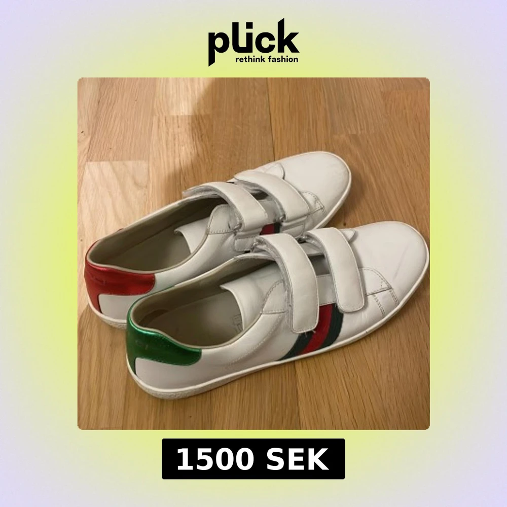 Snygga vita sneakers från Gucci med kardborreband och klassiska ränder i grönt och rött på sidan. Skorna har en röd och en grön detalj på hälen med Gucci-logga. Perfekta för en stilren look. Kartong finns