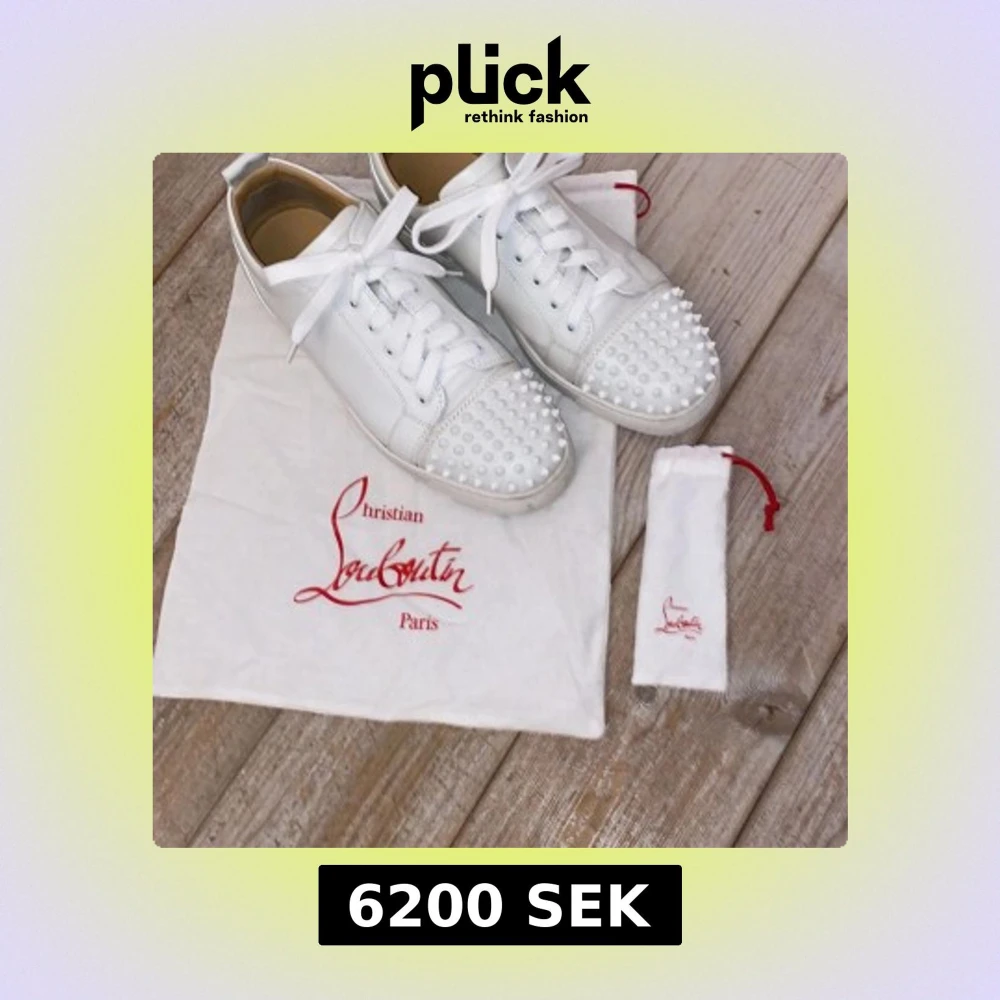 Snygga vita sneakers från Christian Louboutin med ikoniska röda sulor och coola nitar på tån. Skorna har snörning och är tillverkade i skinn, vilket ger en lyxig känsla. Perfekta för att ge din outfit en edgy touch. Mycket bra använda och endast fåtal gånger. Pris går att diskuteras vid snabb affär.