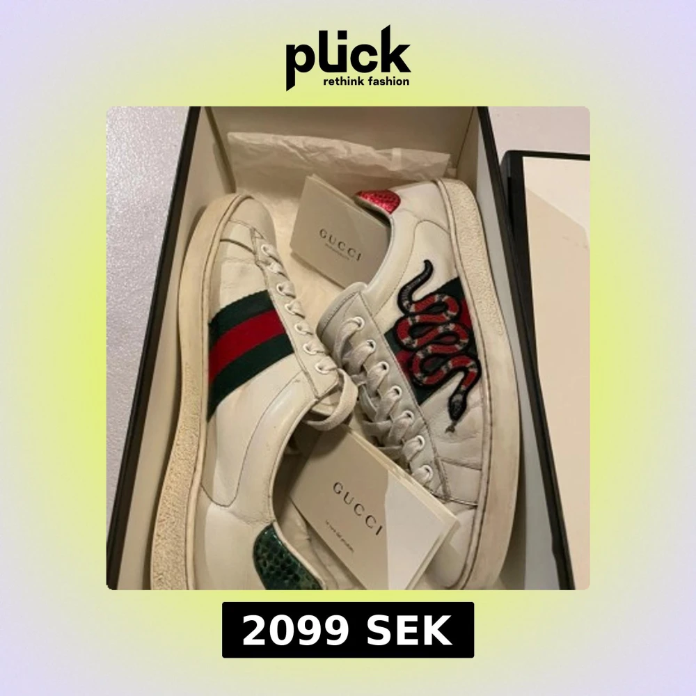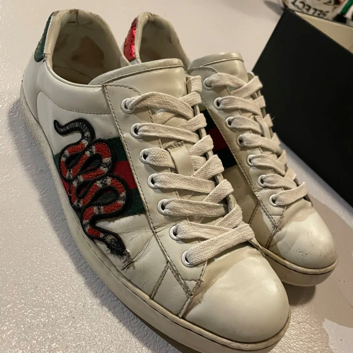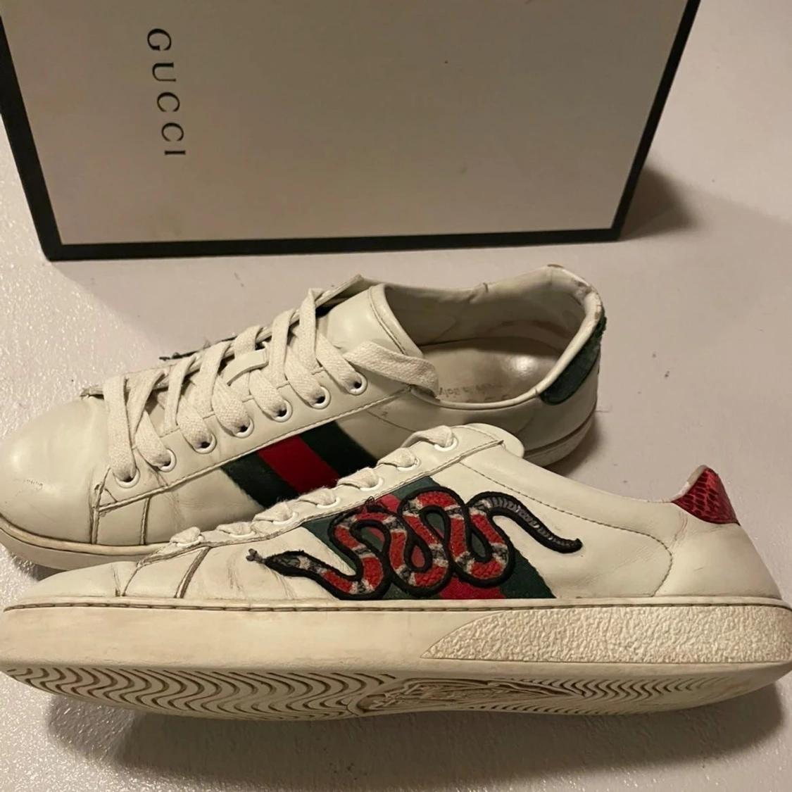 Snygga vita sneakers från Gucci med ett coolt ormmönster på sidan. Skorna har de klassiska gröna och röda ränderna och är tillverkade i skinn. Perfekta för att ge din outfit en lyxig touch.