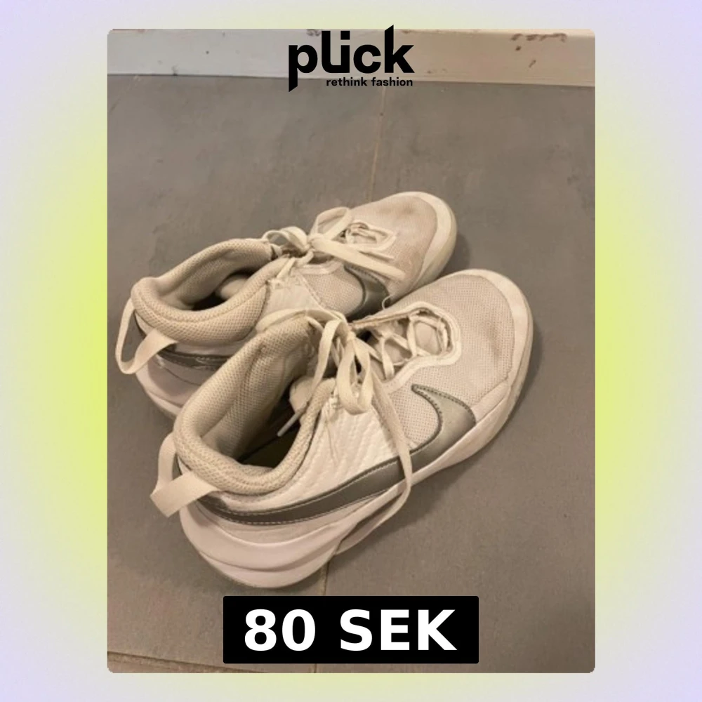 Säljer ett par vita Nike sneakers med silverfärgad swoosh på sidan. Skorna har mesh-överdel för bra ventilation, snörning och platt sula med mönstrad undersida för extra grepp. Perfekt för dig som gillar sportig och clean stil. Storlek 37,5