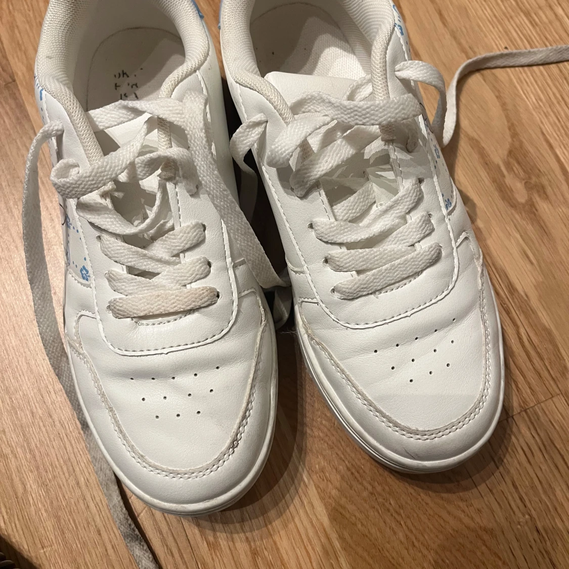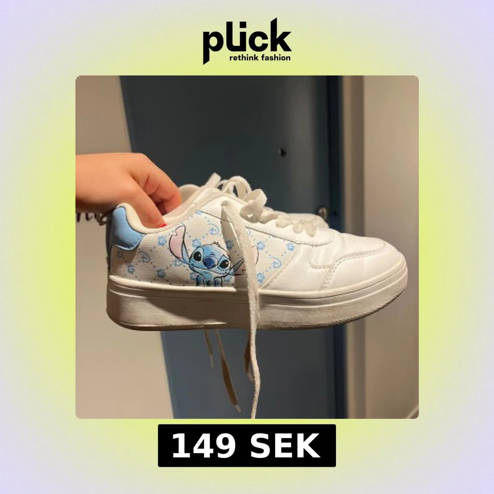 Snygga vita sneakers med ett gulligt Stitch-motiv på sidan. Skorna har blå detaljer och klassisk snörning. Perfekta för dig som älskar Disney och vill ha en unik touch på dina sneakers.