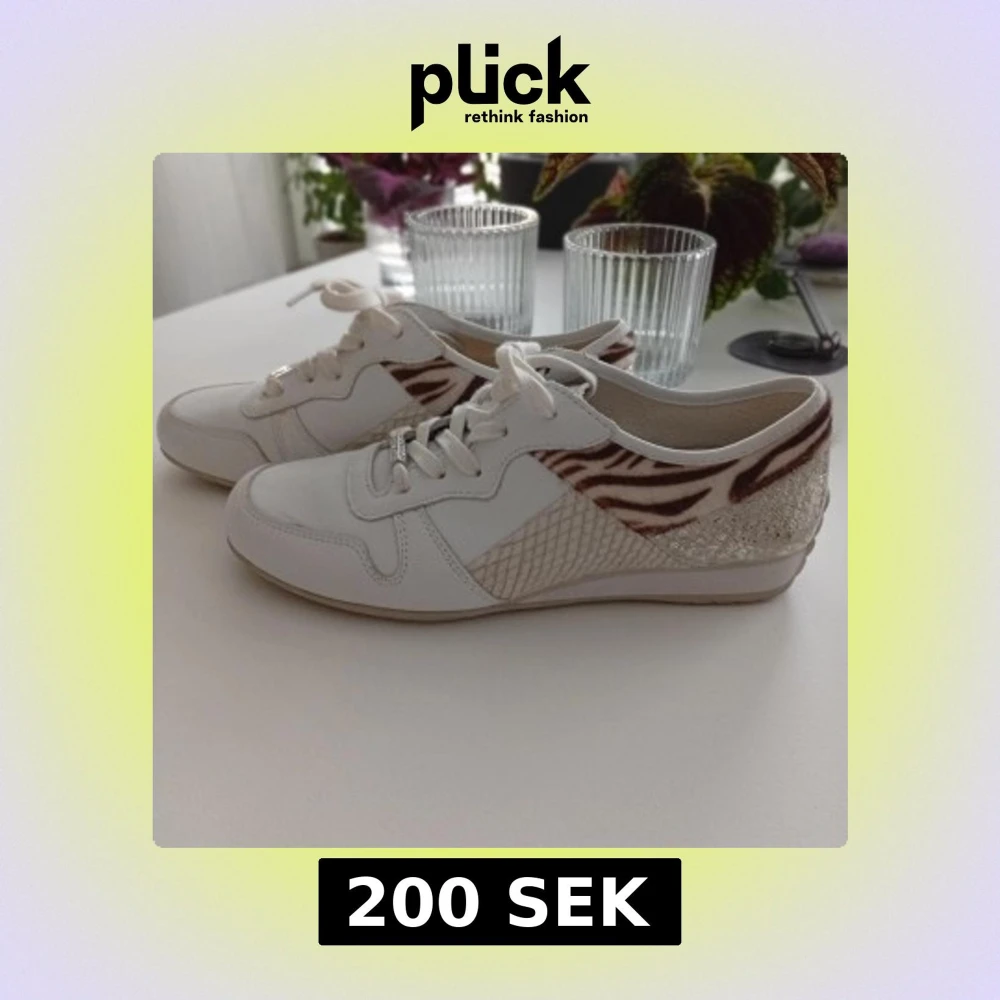 Unika vita sneakers från Gabor med zebramönstrade detaljer i brunt och vitt samt glittrig silverdetalj på hälen. Skorna har snörning med bling på h stilrena men ändå coola skor.