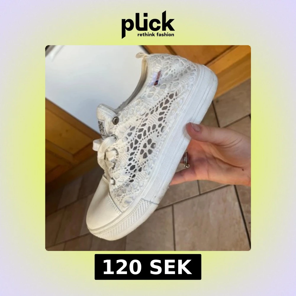 Säljer ett par vita sneakers från OK Sport i storlek 40. Skorna har snygg spetsdetalj på sidorna, snörning framtill och platt sula. Perfekta för dig som gillar en feminin och fräsch stil. Märke och stjärndetaljer på plösen.