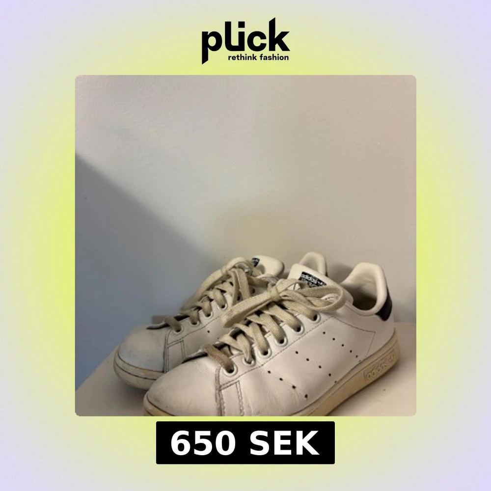 Jättefina klassiska vita Adidas Stan Smith sneakers med mörkblå detaljer på hälen. Skorna har snörning och är tillverkade i skinn. Perfekta för en stilren look. Storlek 38.