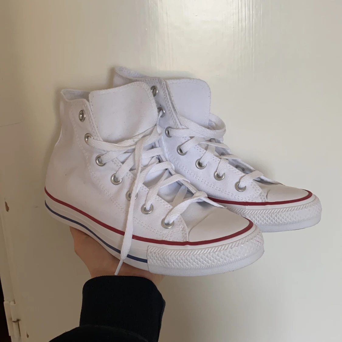 Helt nya vita converse all star HI i jätte fin skick men som inte passade i storlek på mig :( letar efter ett kämpe som skulle vilja gå 1000 mil i de ❤️