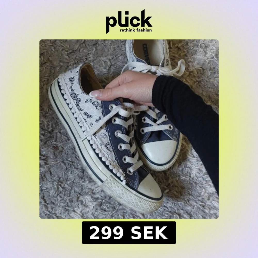 As snygga marinblåa sneakers från Converse med vit spetsdetalj på sidorna. Så fina men säljer då de är lite stora för mig. Köpte på plick och endast använda ett par gånger💕