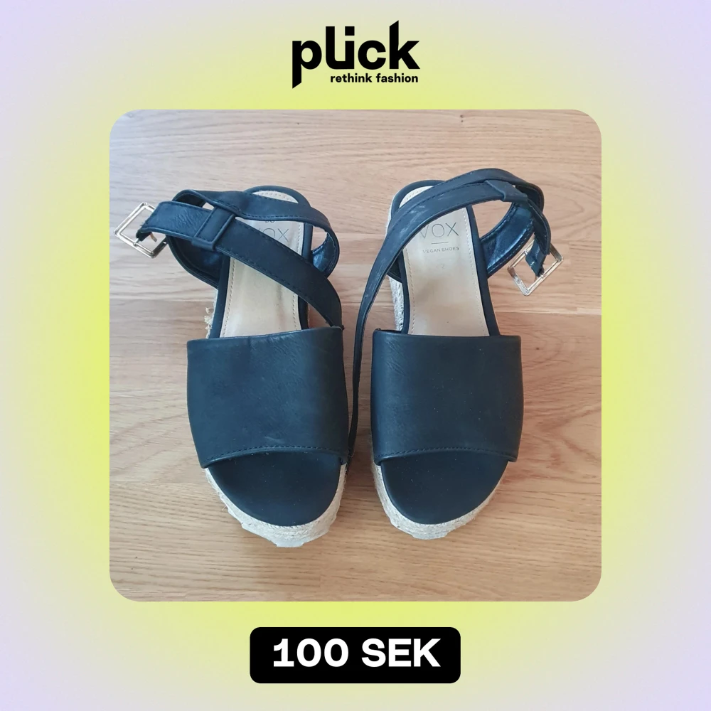 Snygga svarta sandaler från Vox med kilklack och justerbara spännen. Perfekta för sommardagar och ger en stilren look. De har en bekväm passform och är i mycket bra skick.