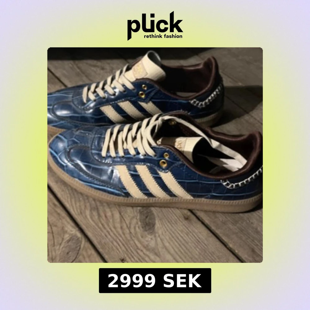 Unika Adidas Samba sneakers med mörkblå, glansig ovandel i krokopräglat skinn och beige detaljer. Perfekt för dig som vill sticka ut. Har kvar boxen, hör av er innan köp för ytterligare info!!!