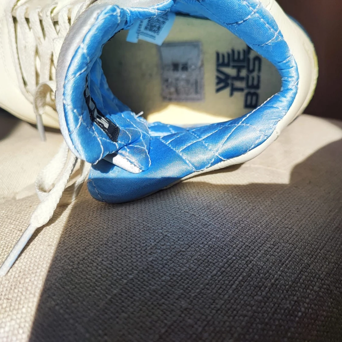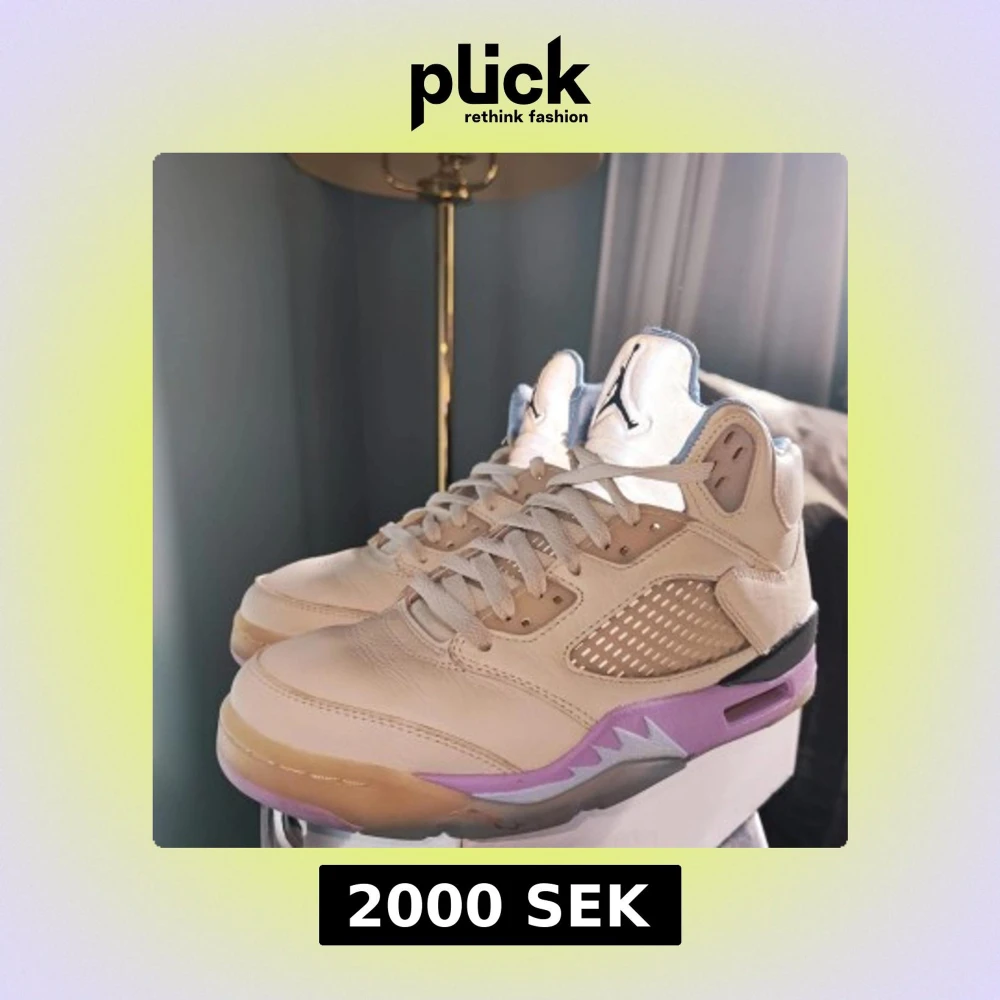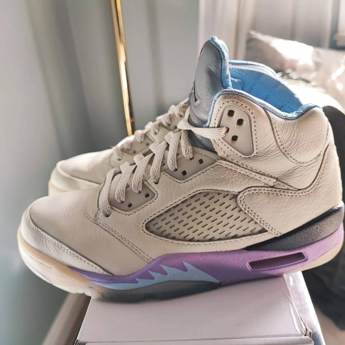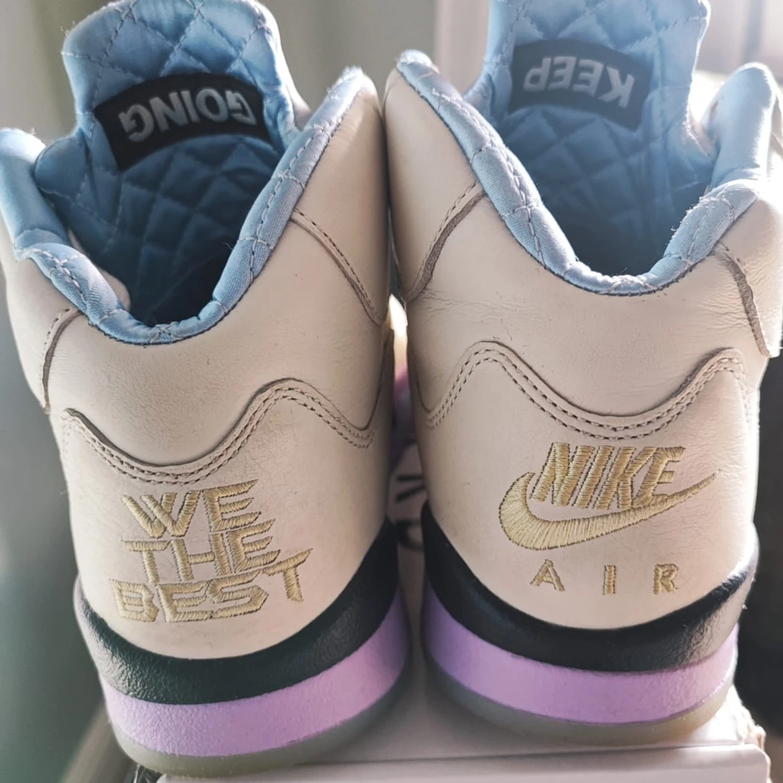 Exklusiva Nike Air Jordan 5 'We The Best' sneakers i ljusbeige skinn med lila och blå detaljer på sulan. Broderad text på hälen, quiltad blå insida och klassisk Jumpman-logga på tungan. Snygg high-top modell med snörning och coola detaljer. We The Best kollektion. Storlek 38.5. Endast använda ett fåtal gånger.