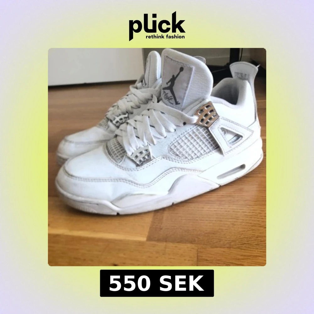 Nike Air Jordan 4 Pure Money sneakers i helvitt med silverdetaljer. Klassisk high-top siluett med snörning och meshpaneler på sidorna. Skorna har en platt sula och är tillverkade i skinn med coola metalliska accenter. Perfekt för dig som vill ha en clean och stilren look.