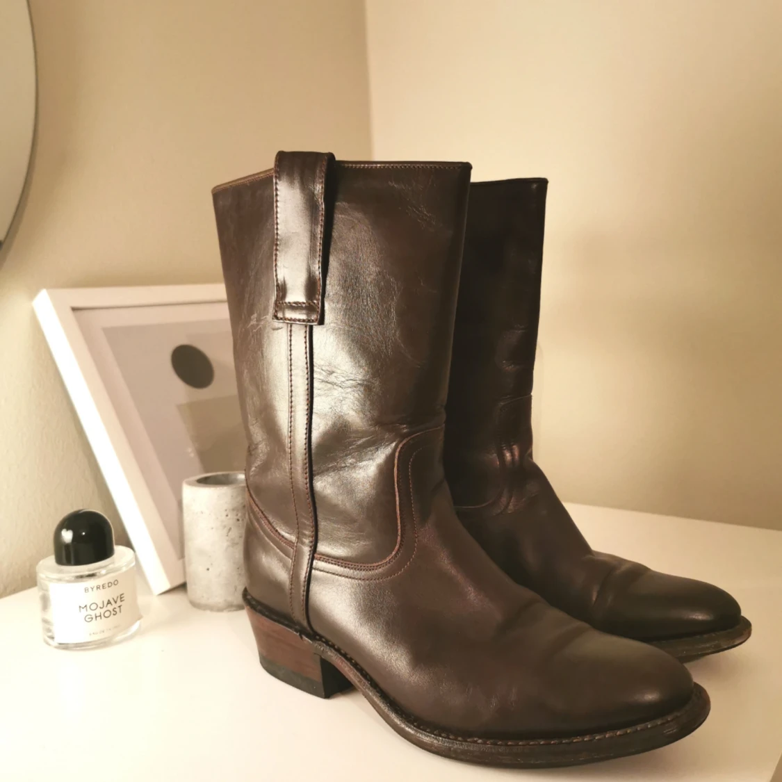 Skinnstövlar från Whyred i stl. 36. Använda ett par gånger och i fint skick, dock en liten defekt på baksidan, se bild 3. Säljer pga för små. Frakt betalas av köparen.