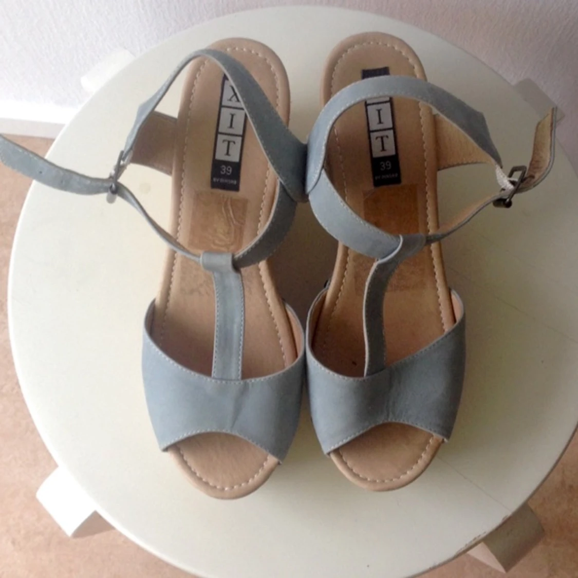 Nästan helt nya sandaler med kilklack i trä och remmar i ljus grå/grönt. Äkta läder. Från XIT.
