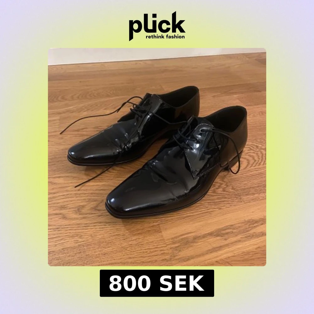 Snygga svarta lackskor med spetsig tå och klassisk snörning. Skorna är använda en kväll och de har inga tecken på slitage. De är i storlek 6,5 alltså ca 40 i svensk storlek. Nypriset på skorna är ca 2300. Skicka dm vid frågor eller vid behov av fler bilder.