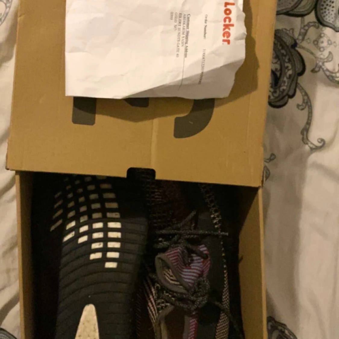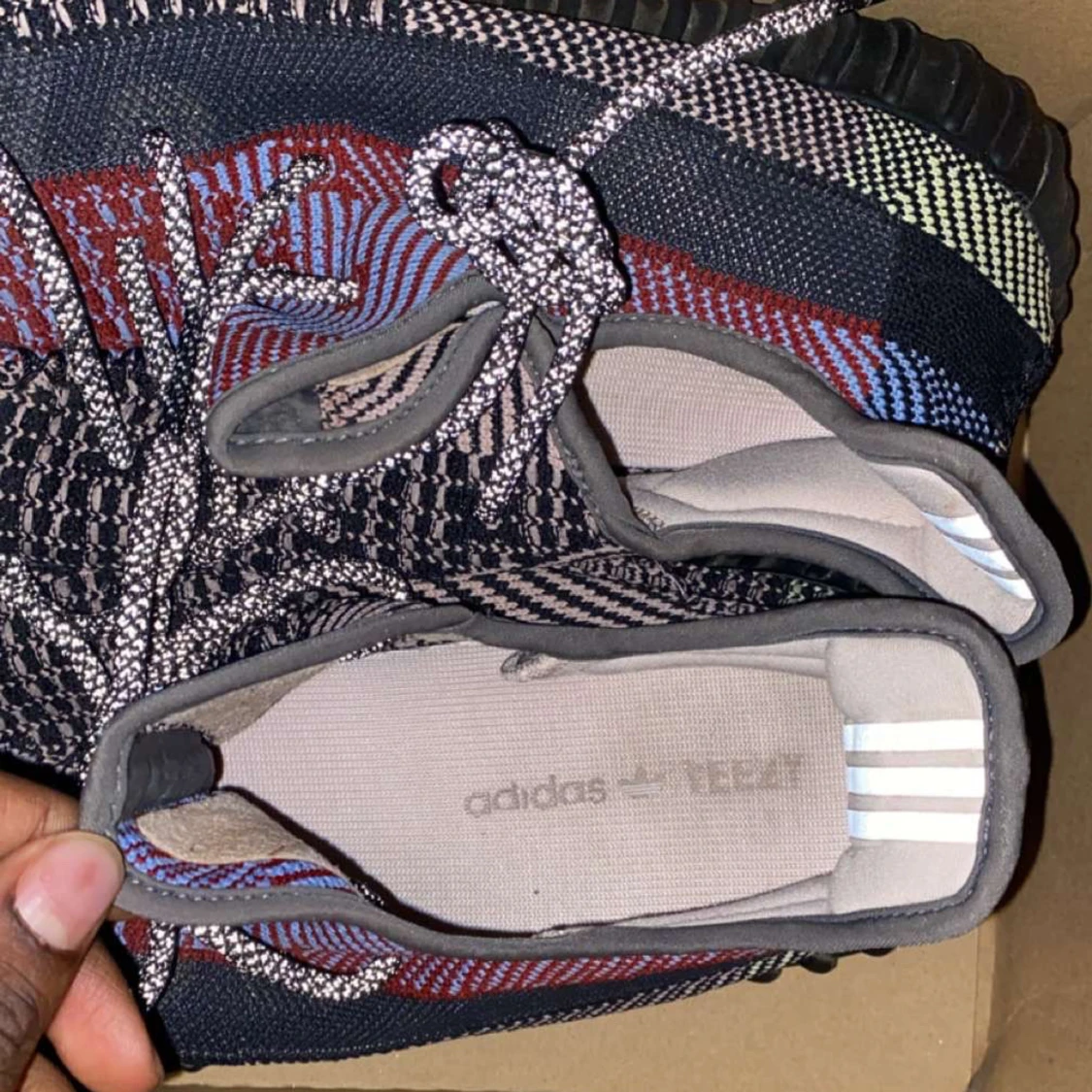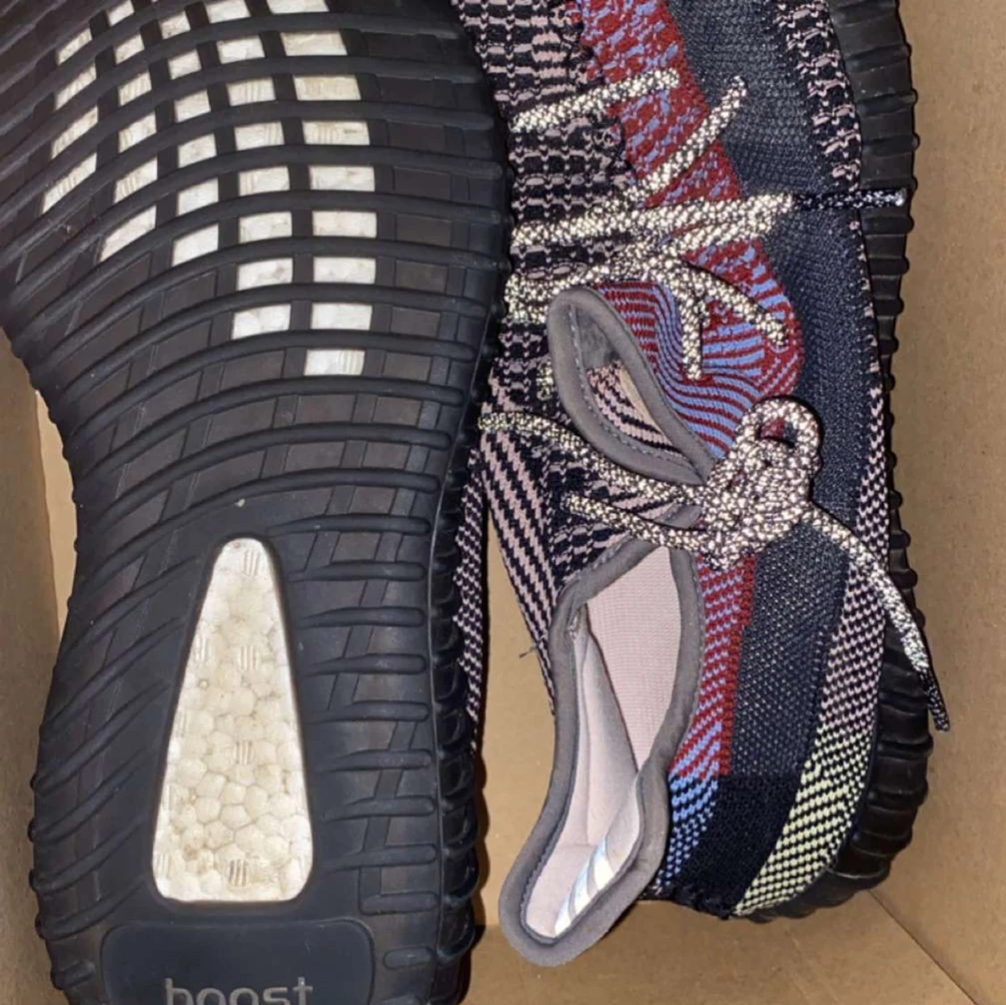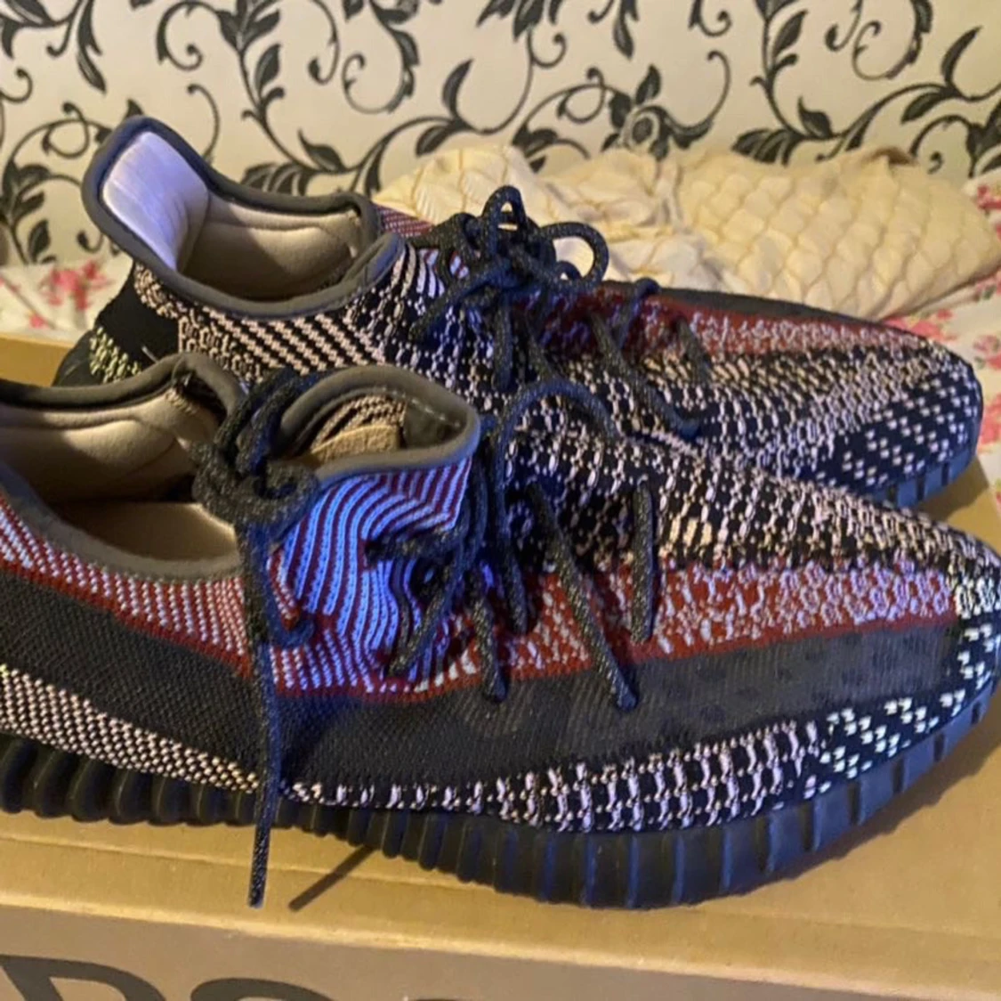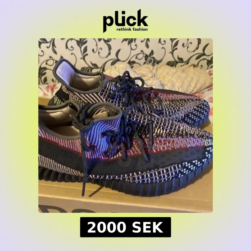 Säljer ett par Adidas Yeezy Boost 350 V2 med ett unikt mönster i svart, röd och blå. köpta för 3200 på footlocker.