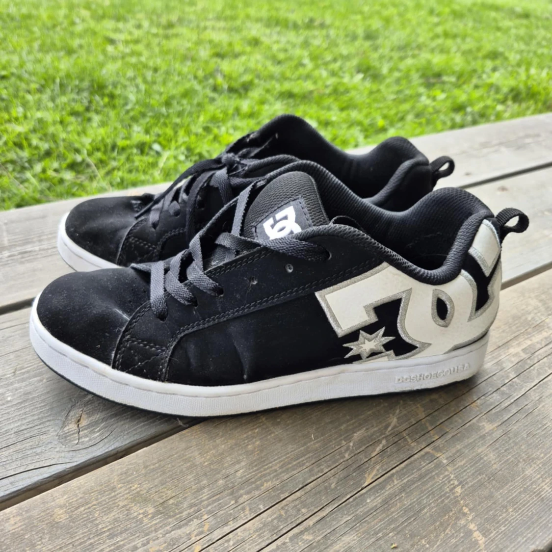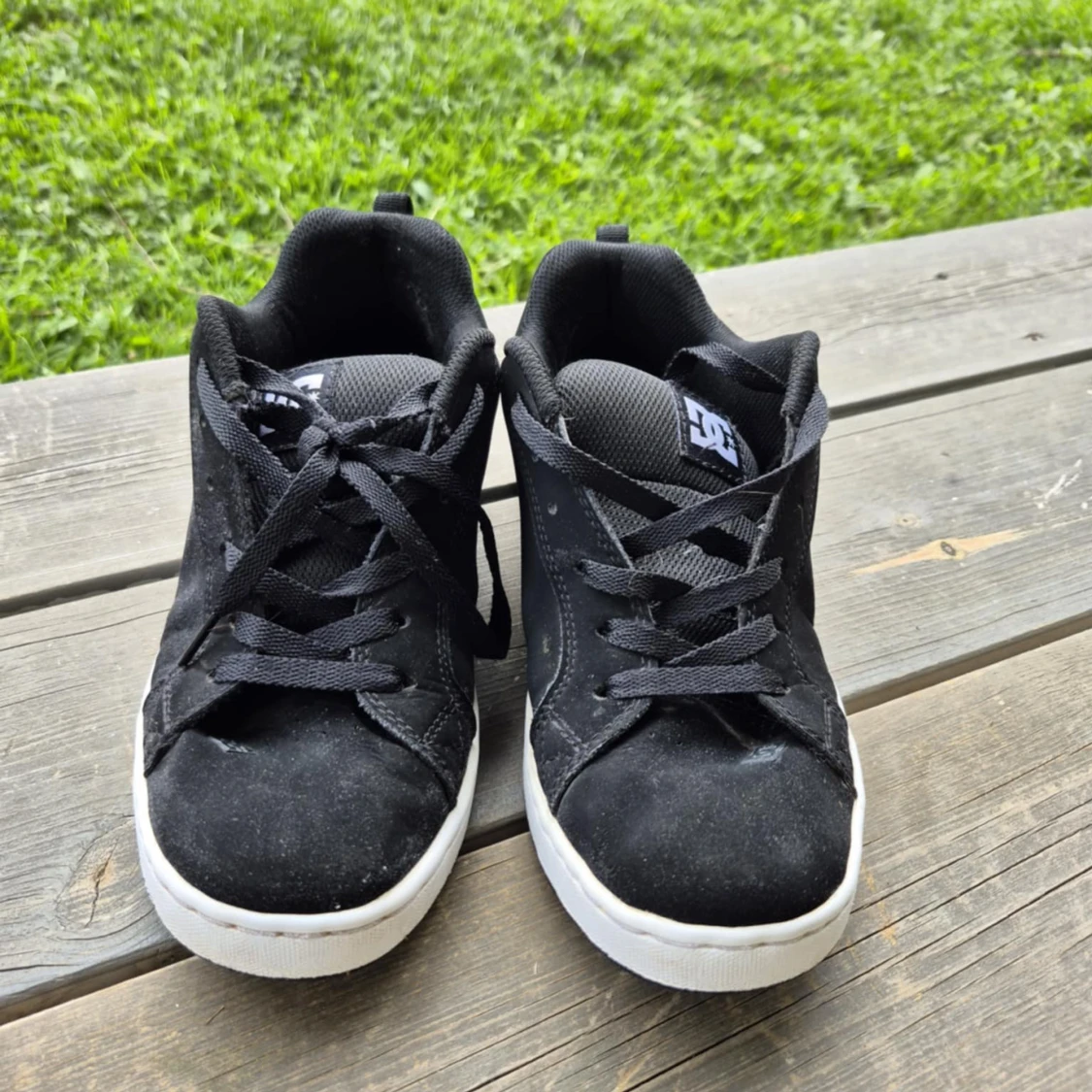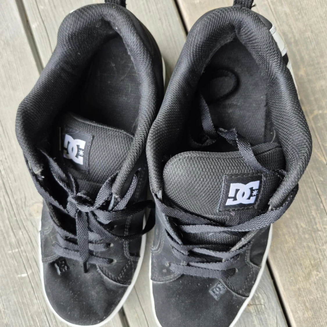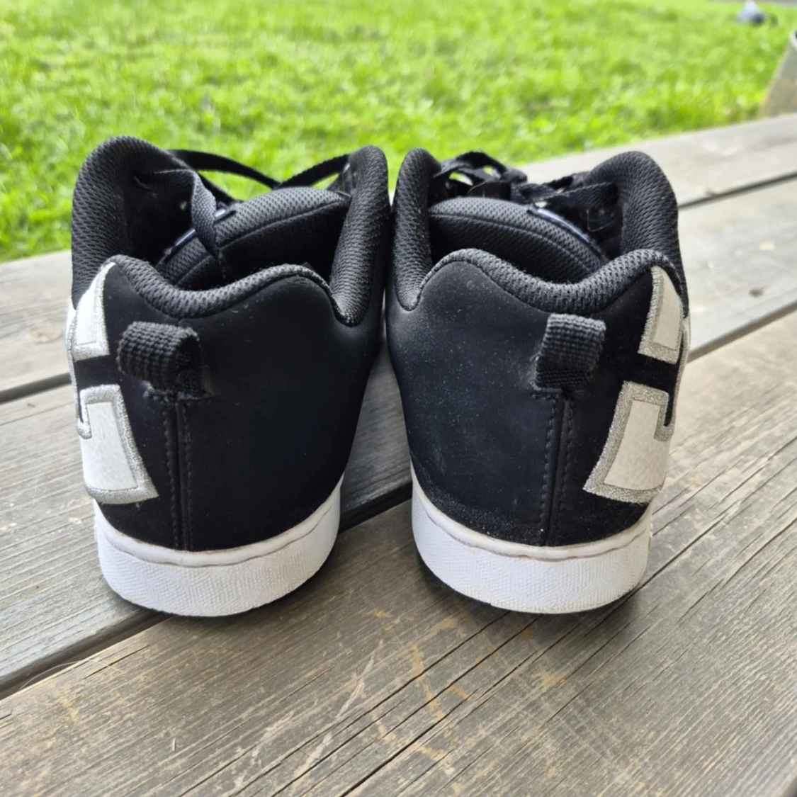 Skorna passar mig som har 38/39 i skostorlek. Svarta sneakers från DC Shoes med vit logga på sidan och vit sula. Klassisk skatemodell med rund tå och platt sula, perfekt för en avslappnad streetstil.