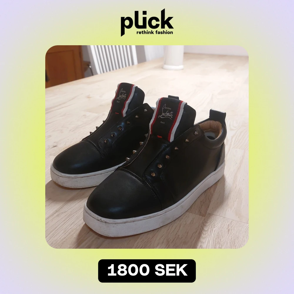 Säljer ett par svarta laceless sneakers från Christian Louboutin. Skorna är i bra skick med lite slitage på sulan, krävs nog endast en tvätt, och slitage vid hälen. Generellt är skicket 7/10. Storleken är 41, men passar mig som är 42,5 perfekt. Inget OG följer med, därav ett lägre pris. Nypris: 10000. Mitt pris: 1000. Hör av dig vid funderingar
