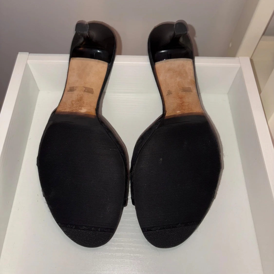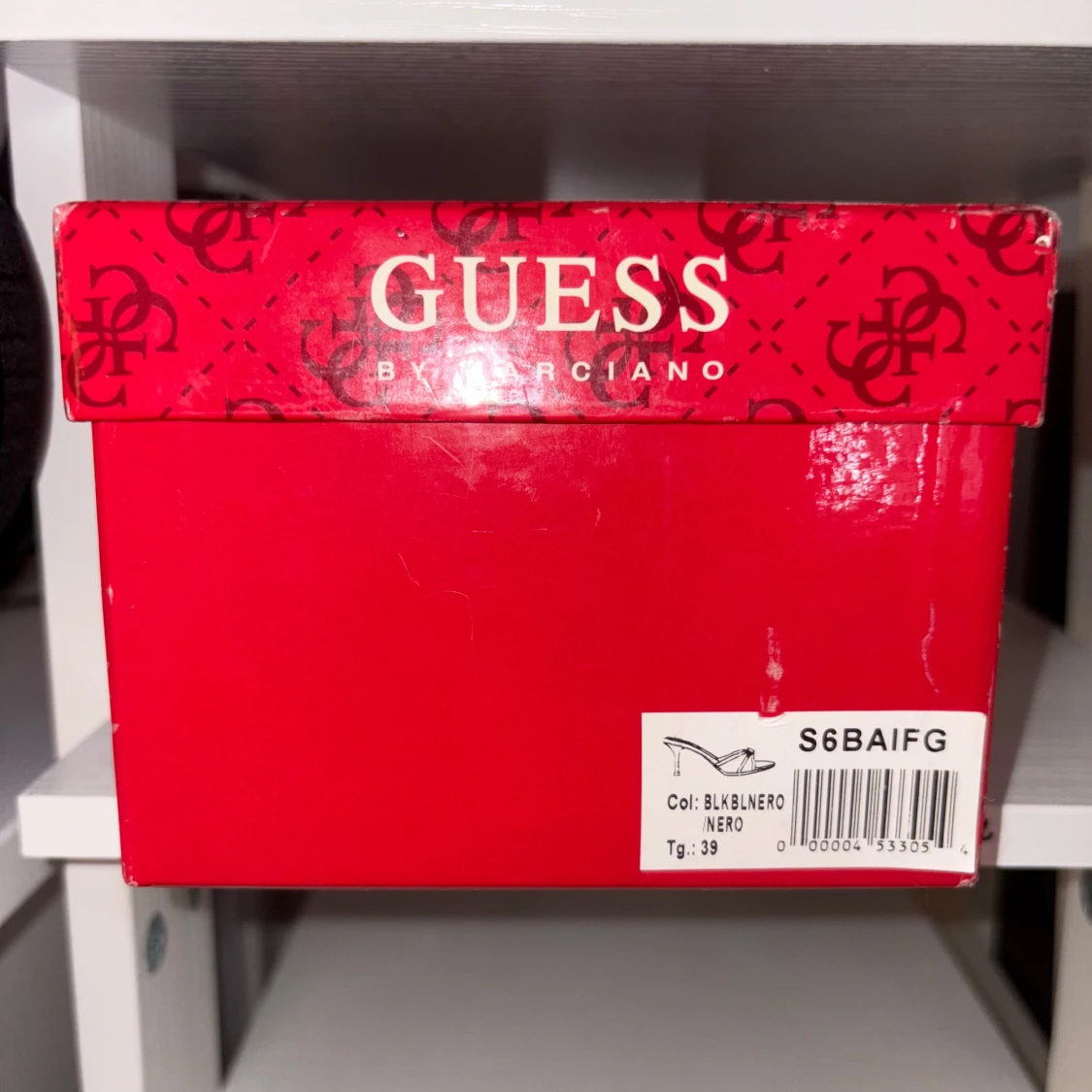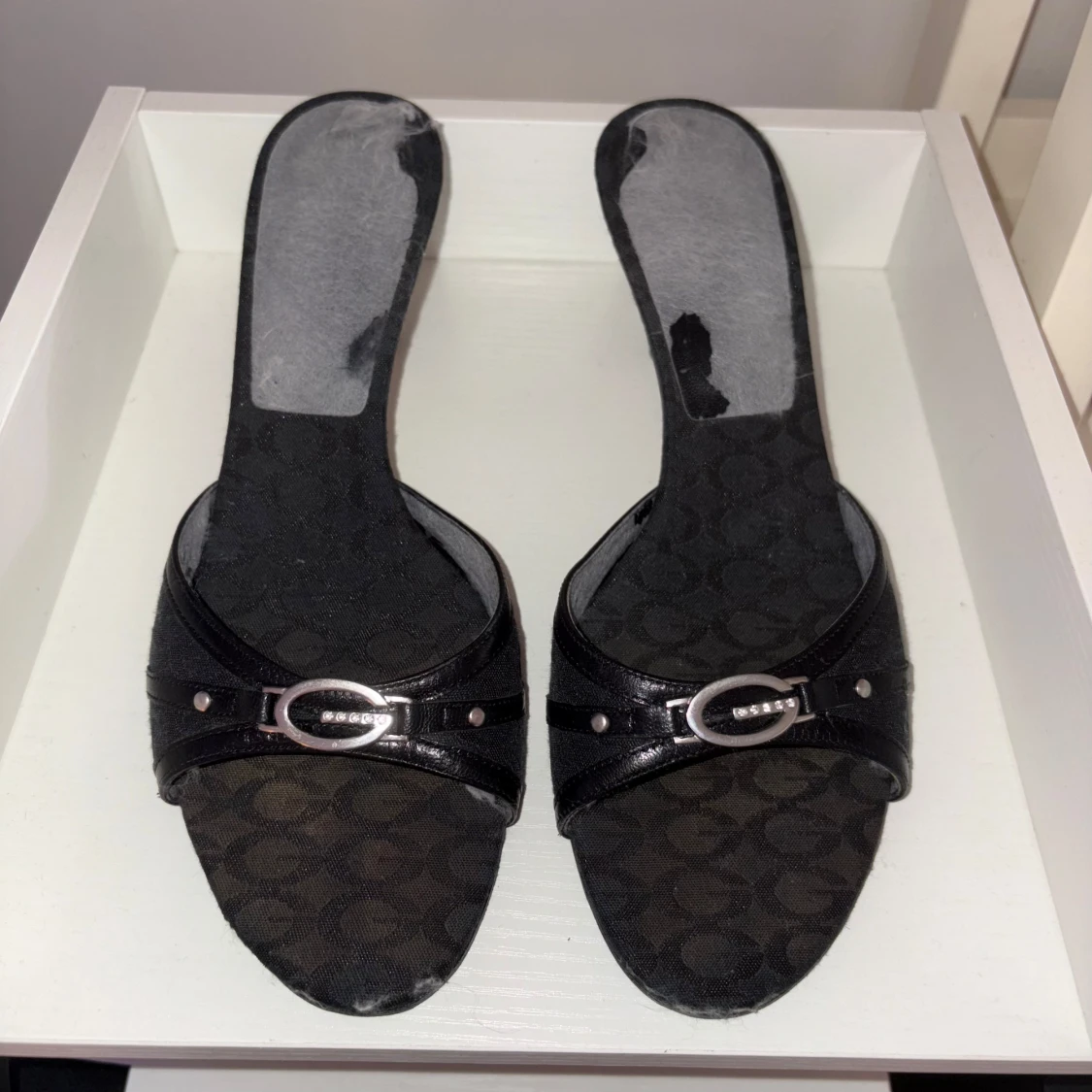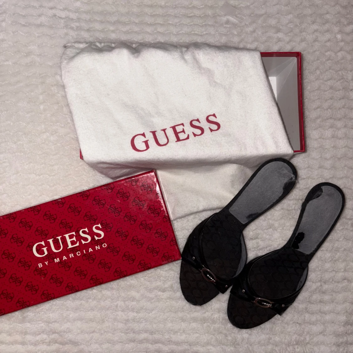 Snygga svarta sandaler från Guess med öppen tå och låg klack. Skorna har ett diskret mönster med Guess-logga på hela ovandelen och en silverfärgad detalj framtill. Tillverkade i syntetmaterial med läderdetaljer och levereras med originalkartong och dustbag.