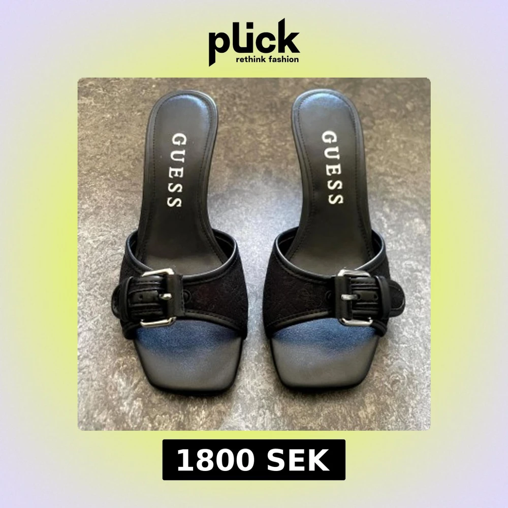 Stilrena svarta klackar från Guess med öppen tå och smyckat silver spänne. Klackarna är tillverkade i skinn med diskret mönster på remmen. Perfekta för dig som vill ha en trendig och elegant look.