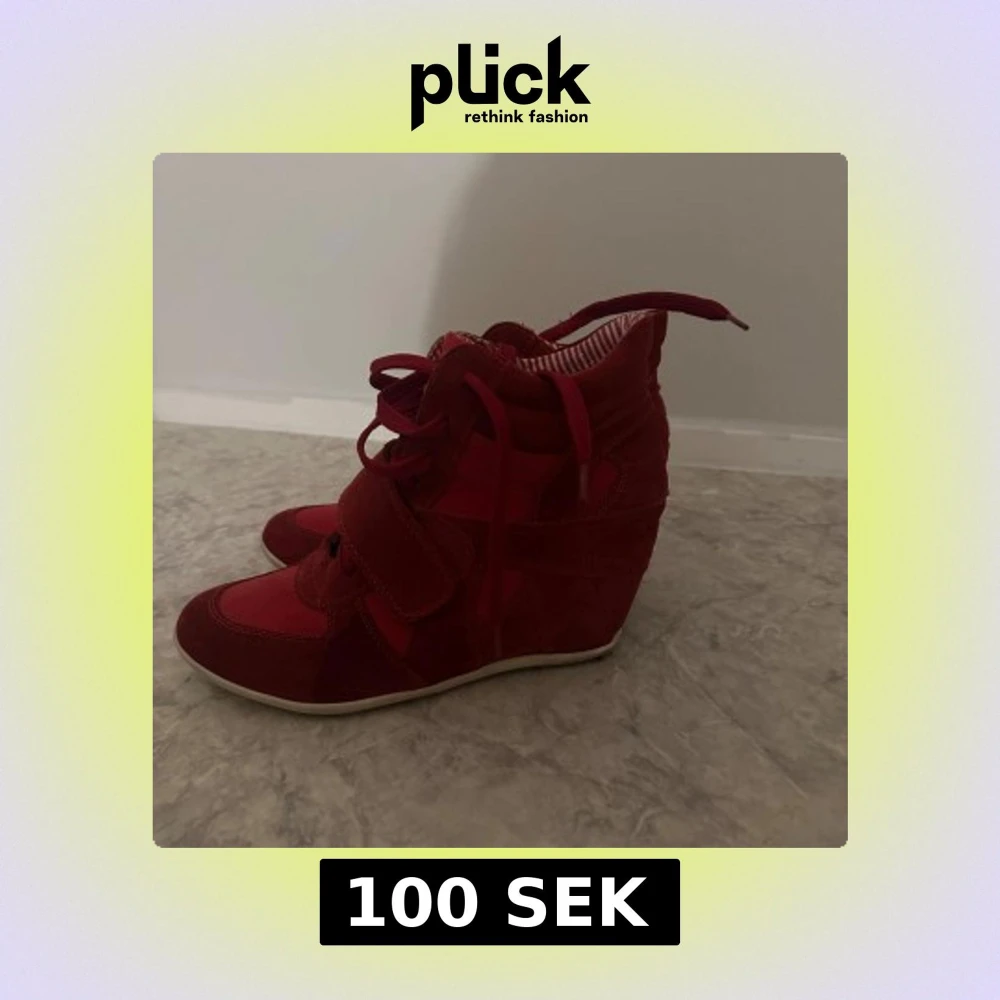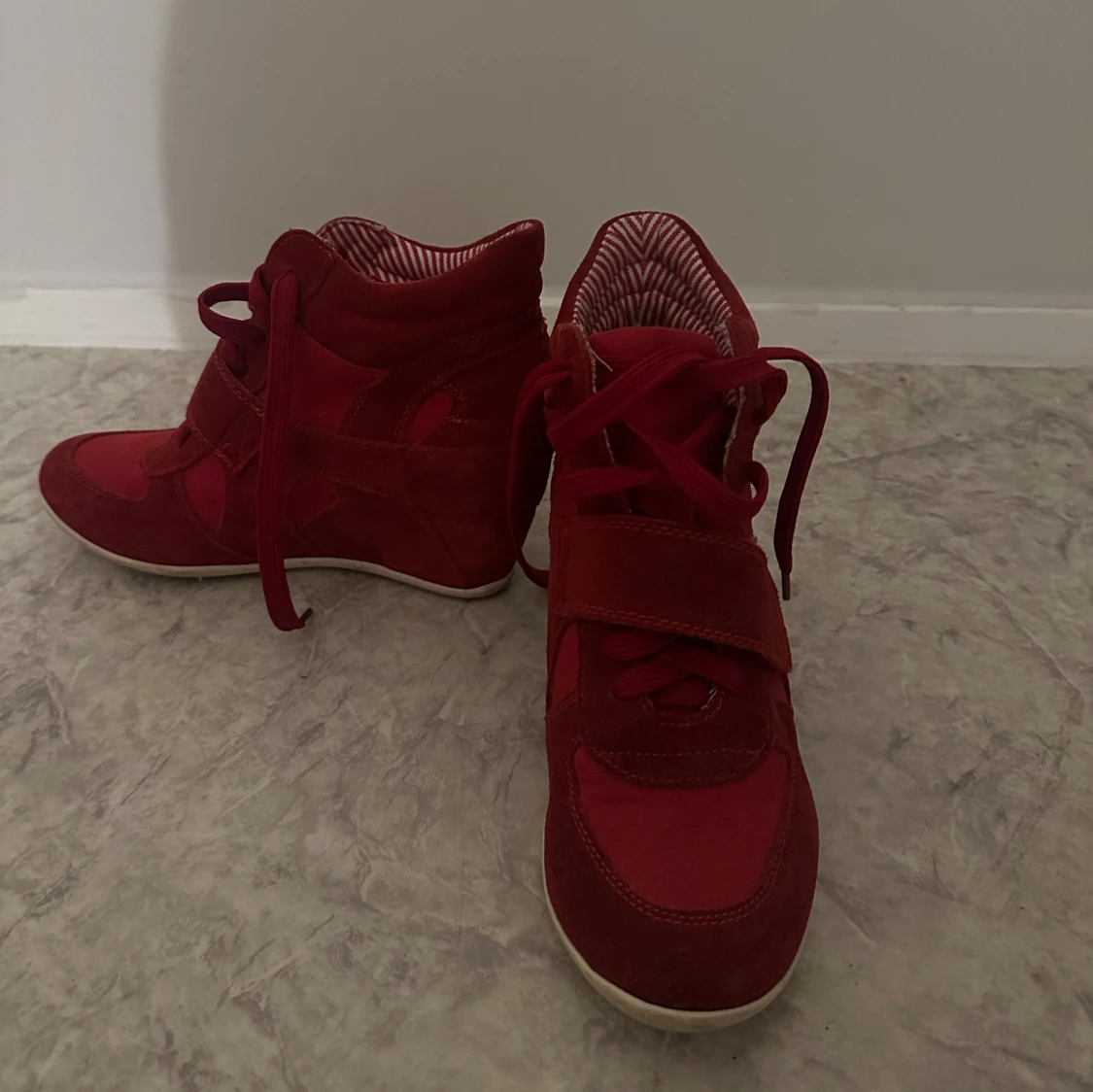 Snygga röda sneakers med kilklack och snörning. Skorna har en mix av mocka och textil, samt kardborreband över vristen. Insidan är fodrad med röd- och vitrandigt tyg. Perfekta för dig som vill ha lite extra höjd men ändå en sportig look.