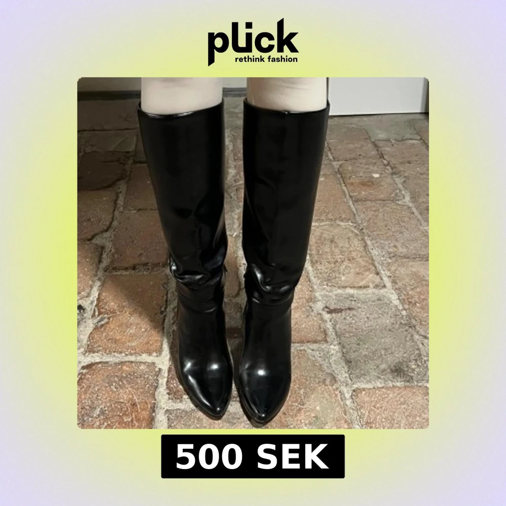Säljer ett par svarta höga stövlar med snygg spetsig tå och bred klack. Stövlarna är tillverkade i blankt skinn och har dragkedja på insidan för enkel påtagning.