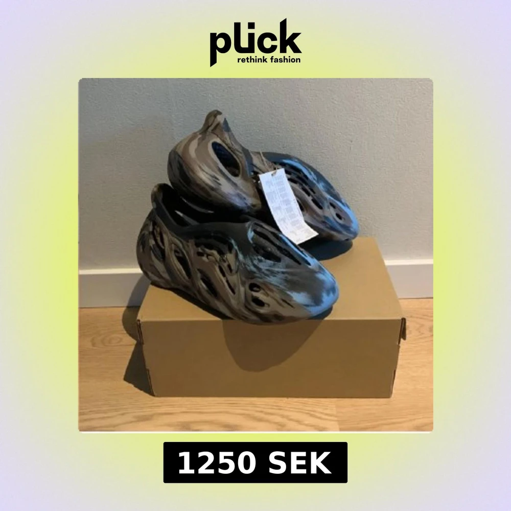 Säljer ett par Adidas Yeezy Foam Runner MX Carbon med unik marmorerad design i svart, blått och grått. Skorna har en futuristisk form med många hål för ventilation. Perfekt för dig som gillar att ha det luftigt runt foten. Kvitto finns och bara att höra av sig vid funderingar😀