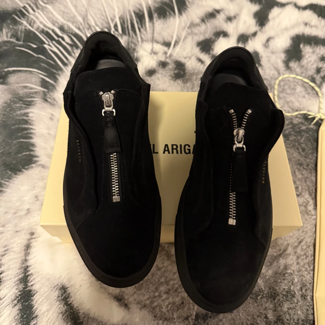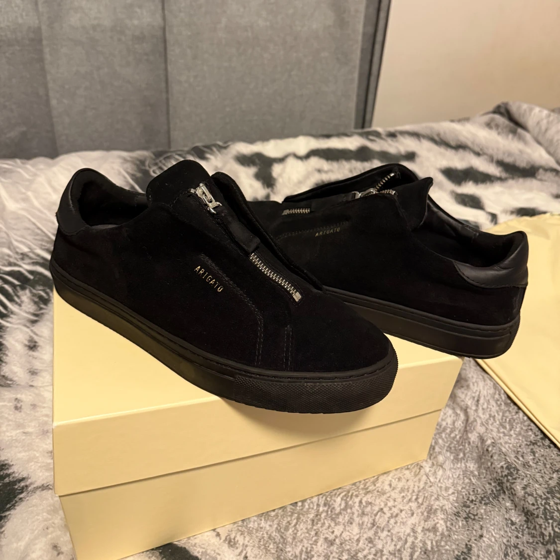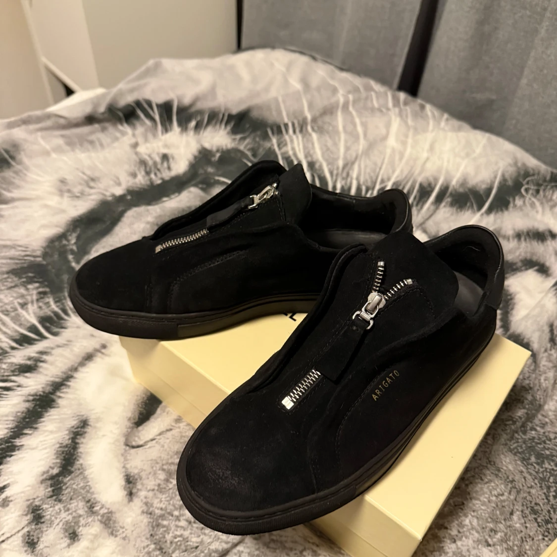 Stilrena svarta sneakers från Axel Arigato i mocka med dragkedja framtill istället för klassisk snörning. Låg modell med diskret logga i guld på sidan och svart platt sula. Perfekta för dig som gillar minimalistisk och modern design. Helt nya använda typ 4 gånger, box och påse följer med!