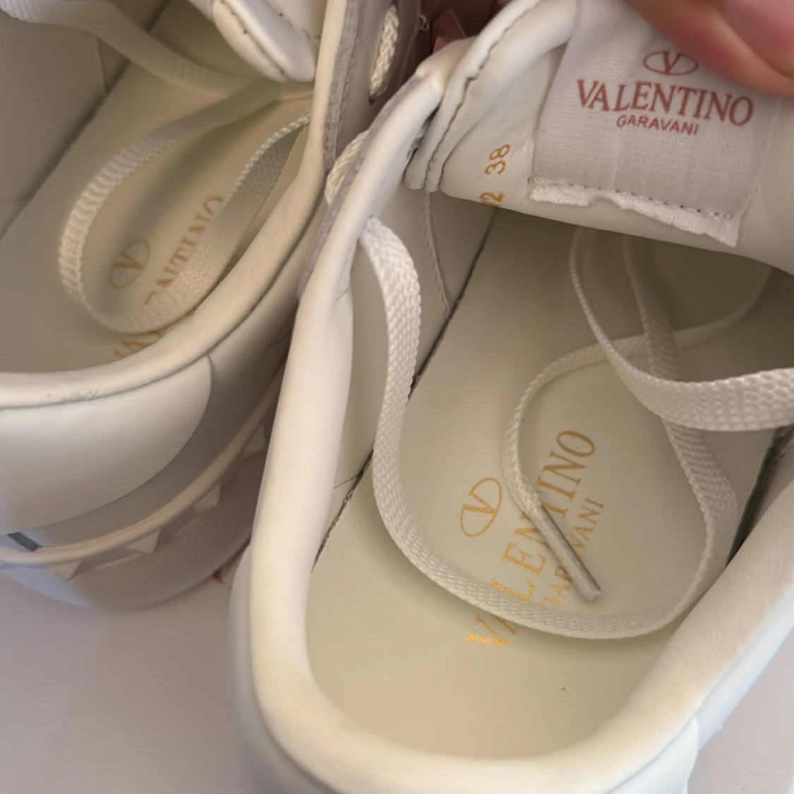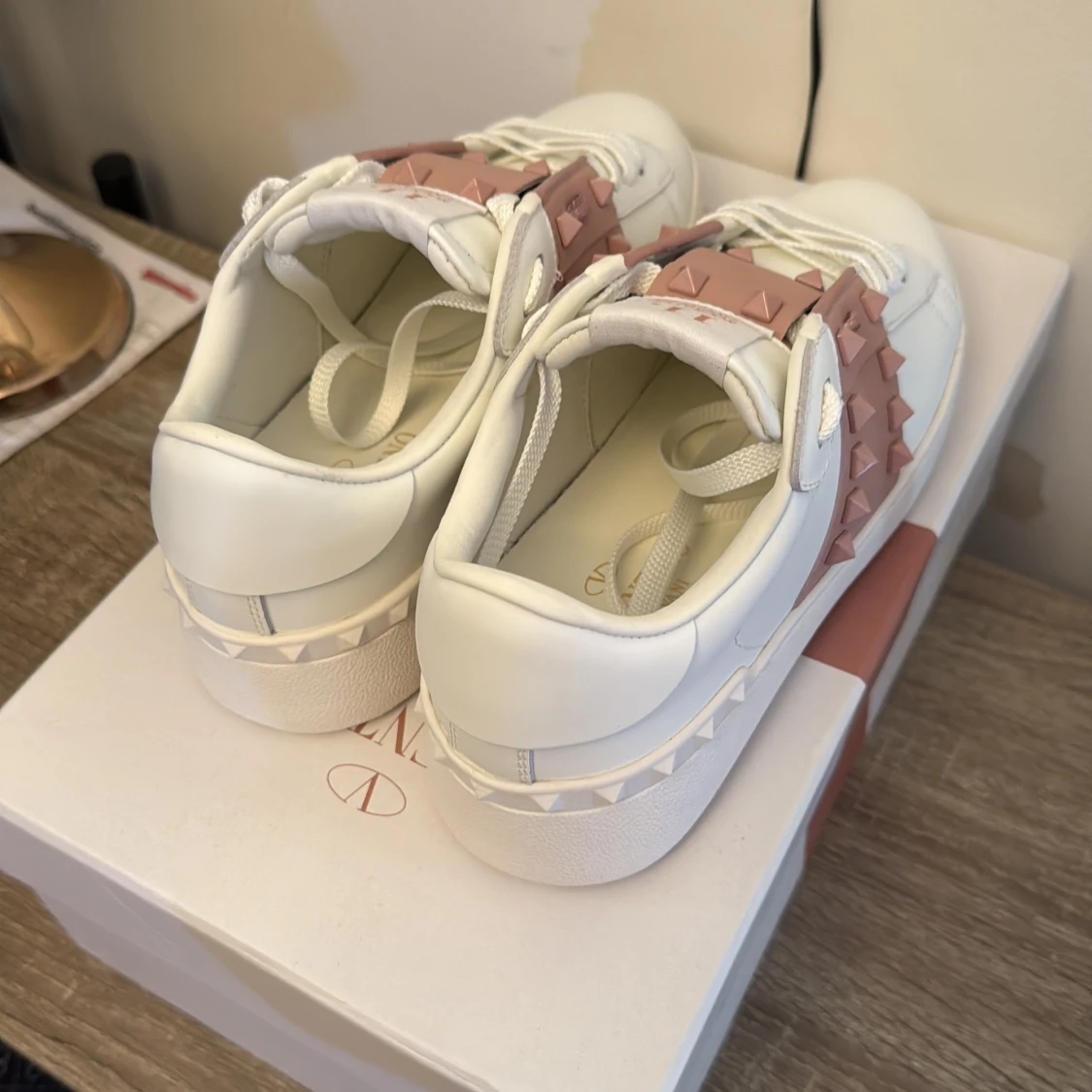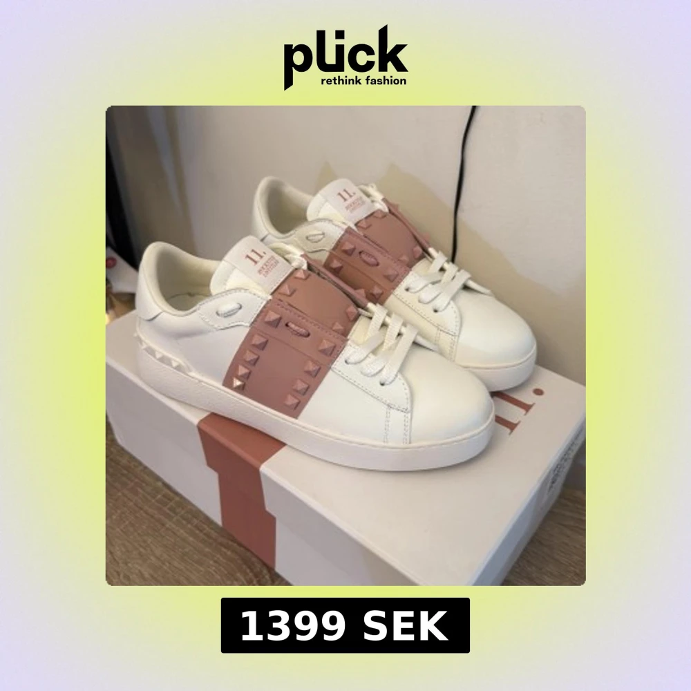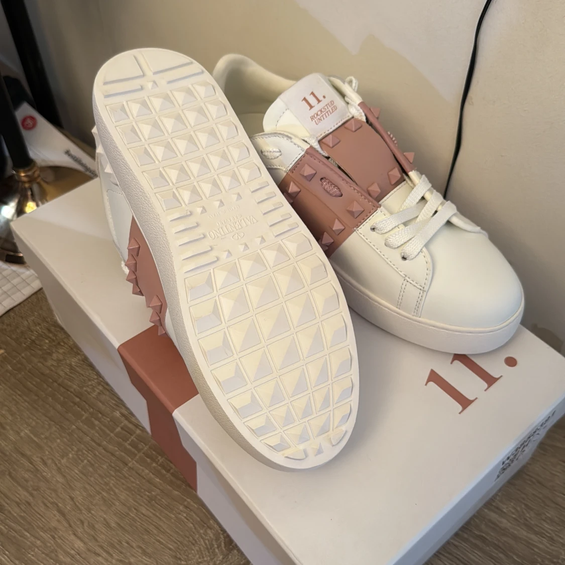 Snygga vita Valentino Garavani Rockstud sneakers med breda ljusrosa band och ikoniska nitar. Skorna har rund tå, platt sula och är gjorda i lyxigt skinn. Perfekta för dig som vill sticka ut med en exklusiv touch och coola detaljer.