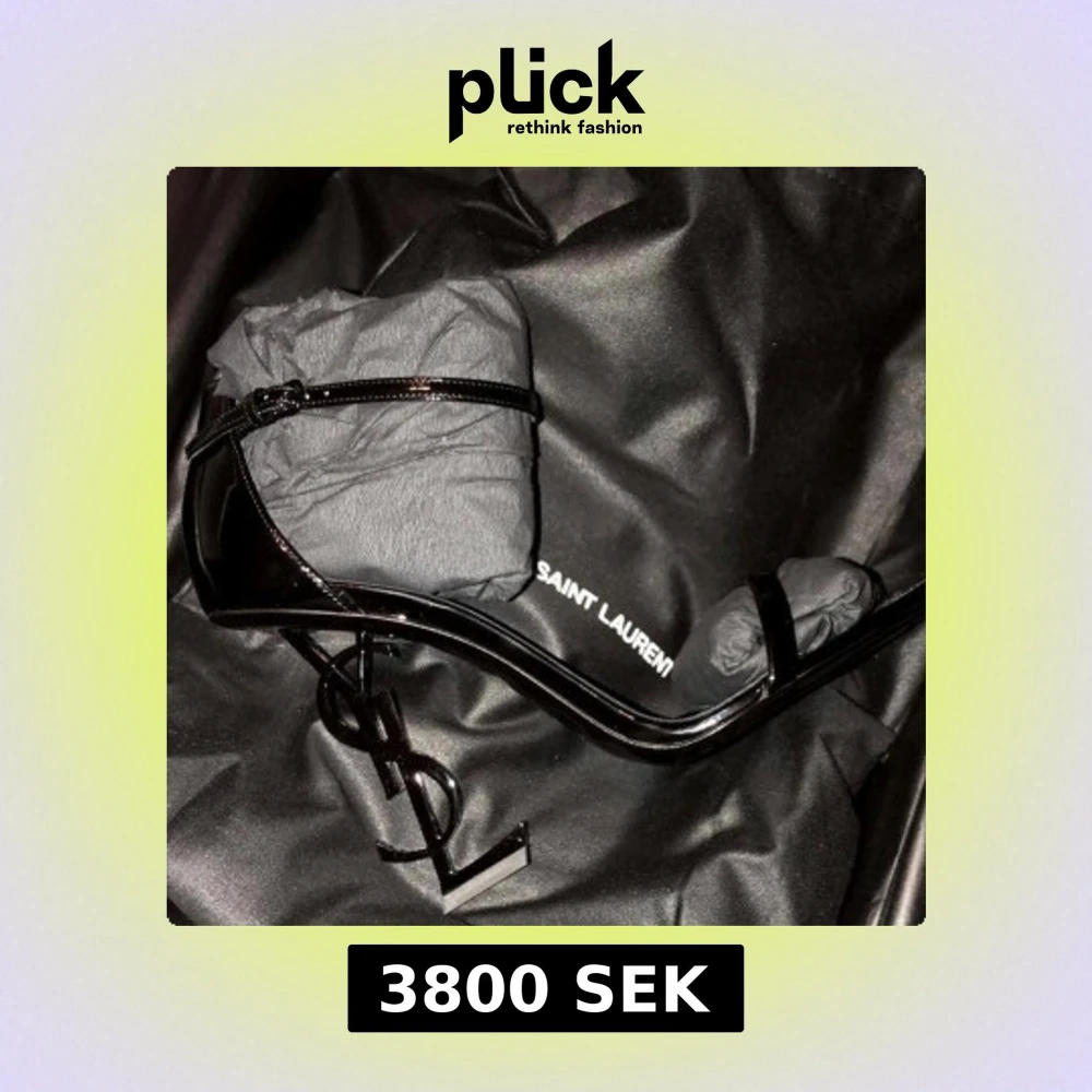 Snygga svarta sandaler från Saint Laurent med tunn rem över tårna och runt vristen. Klacken är formad som YSL-loggan vilket ger en unik och lyxig vibe. Skorna är i glansigt skinn och har öppen tå och hög klack. Perfekta för dig som vill sticka ut. Säljer de pga att de inte kommer till användning längre ordpris 12.000kr, pris kan diskuteras vid snabb affär