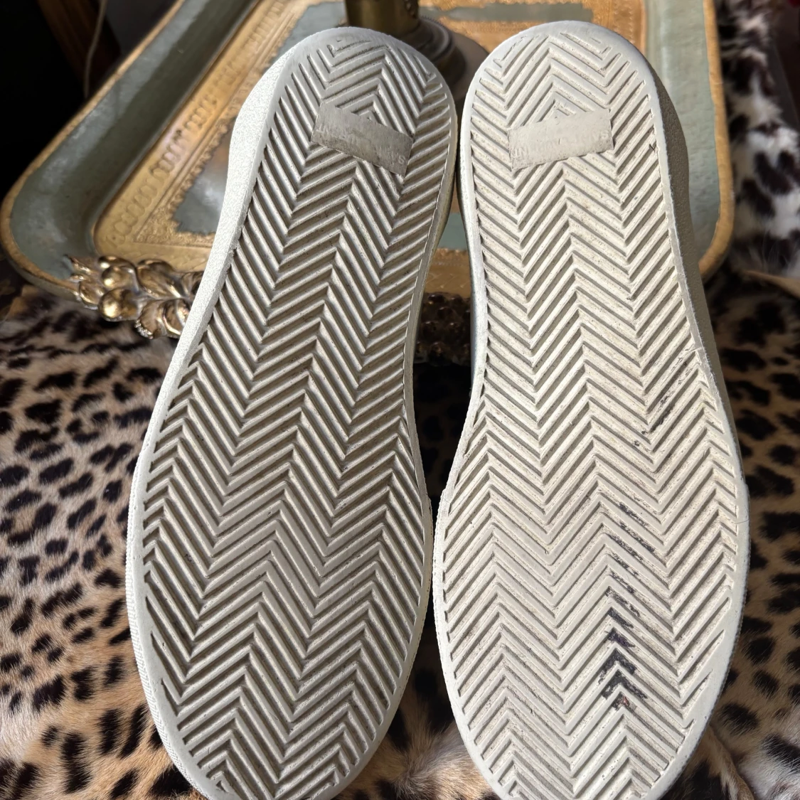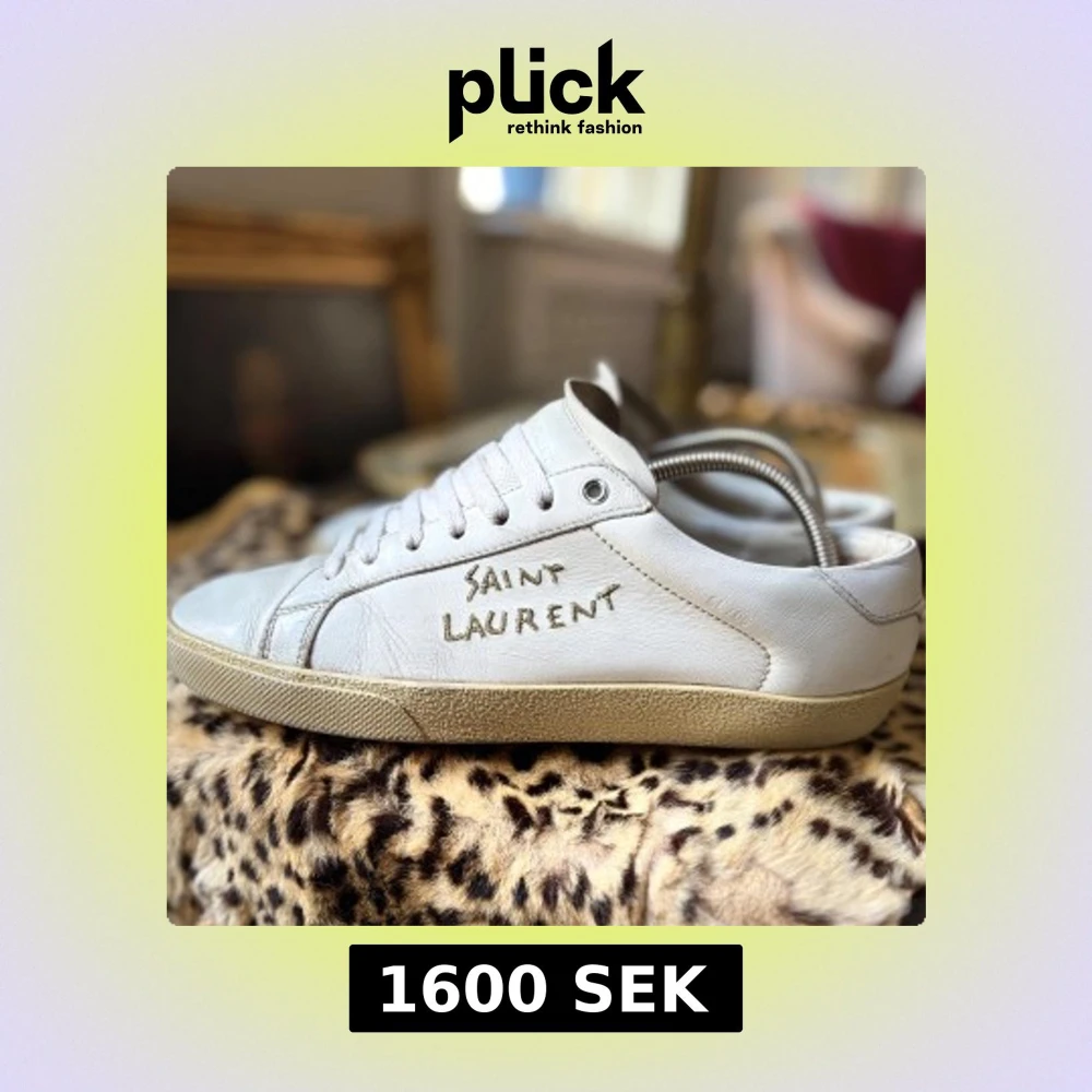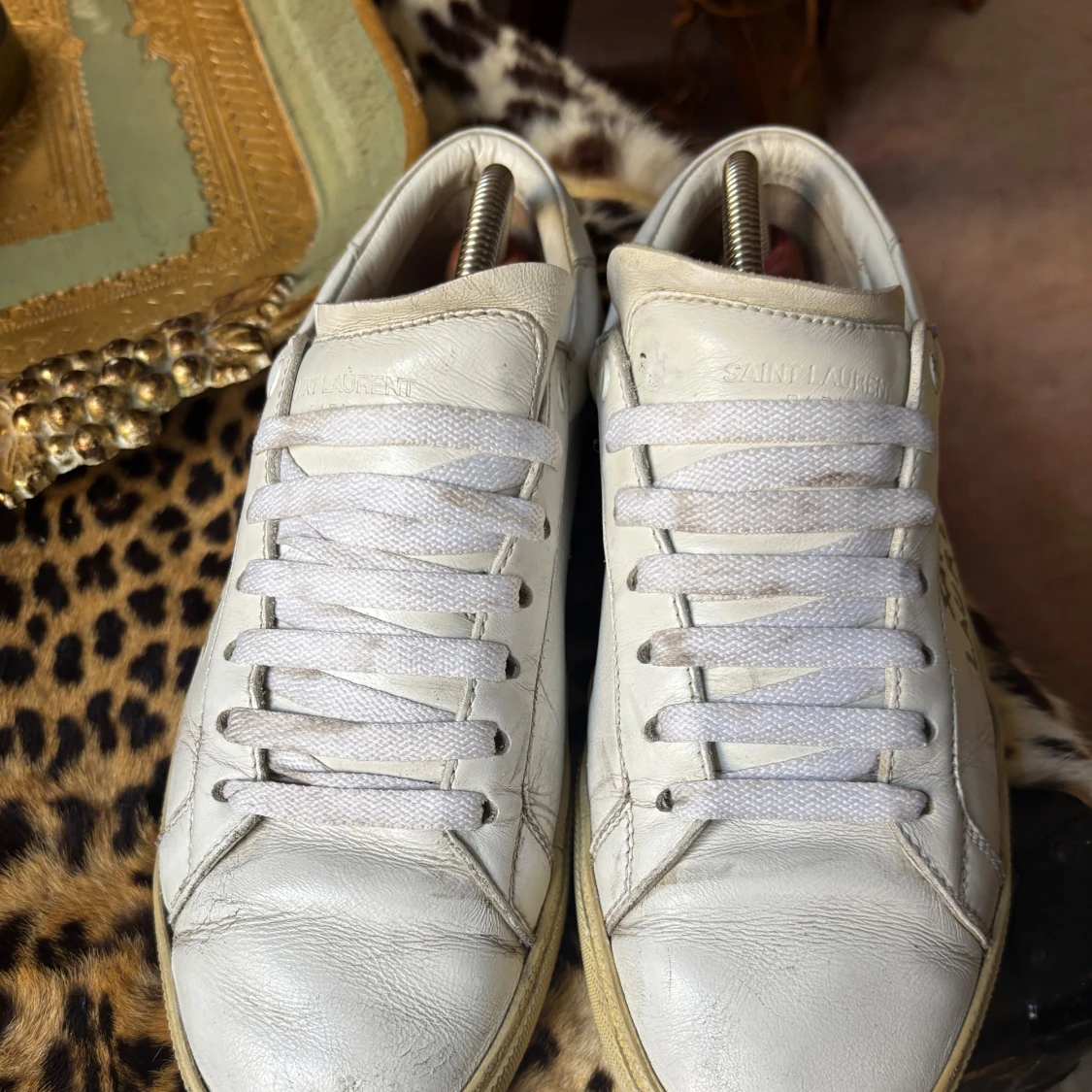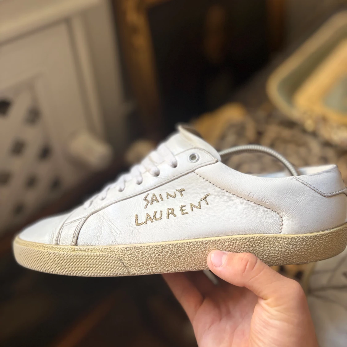 Säljer ett par ÄKTA sneakers från Saint Laurent med handskriven logga på sidan. Skorna är tillverkade i Italien och har en klassisk rund tå, platt sula och snörning. Materialet är mjukt skinn och de har en stilren, minimalistisk look som passar till jeans eller dressade outfits storleken är 41,5 men passar 42 skicka är 7/10 men har mycket att ge priset kan diskuteras