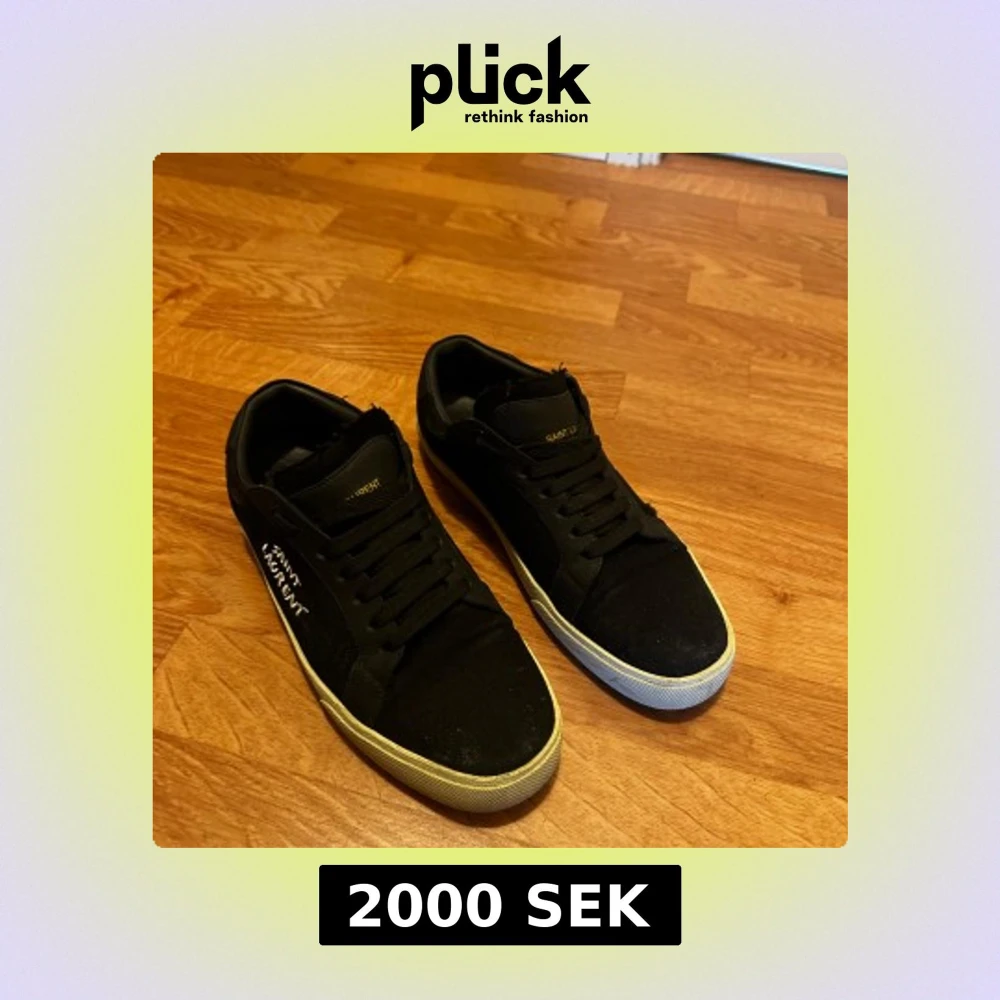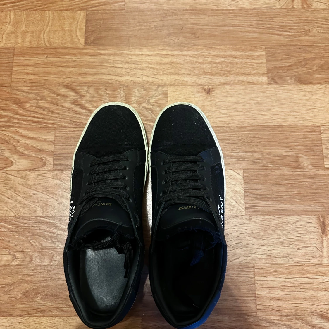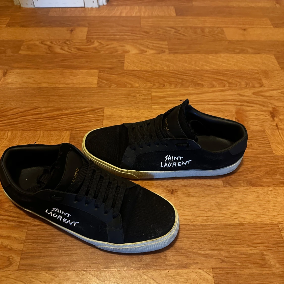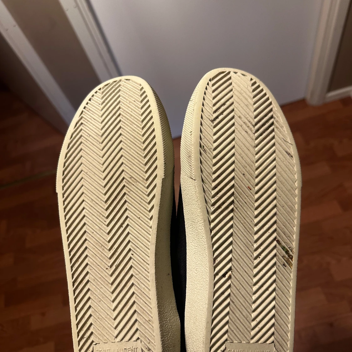 Svarta sneakers från Saint Laurent med vit logga broderad på sidan. Skorna har svarta snören, rund tå och vit platt sula. Ovandelen är i en mix av skinn och textil, vilket ger en clean och stilren look. Perfekta för dig som gillar exklusiva streetwear-vibbar.