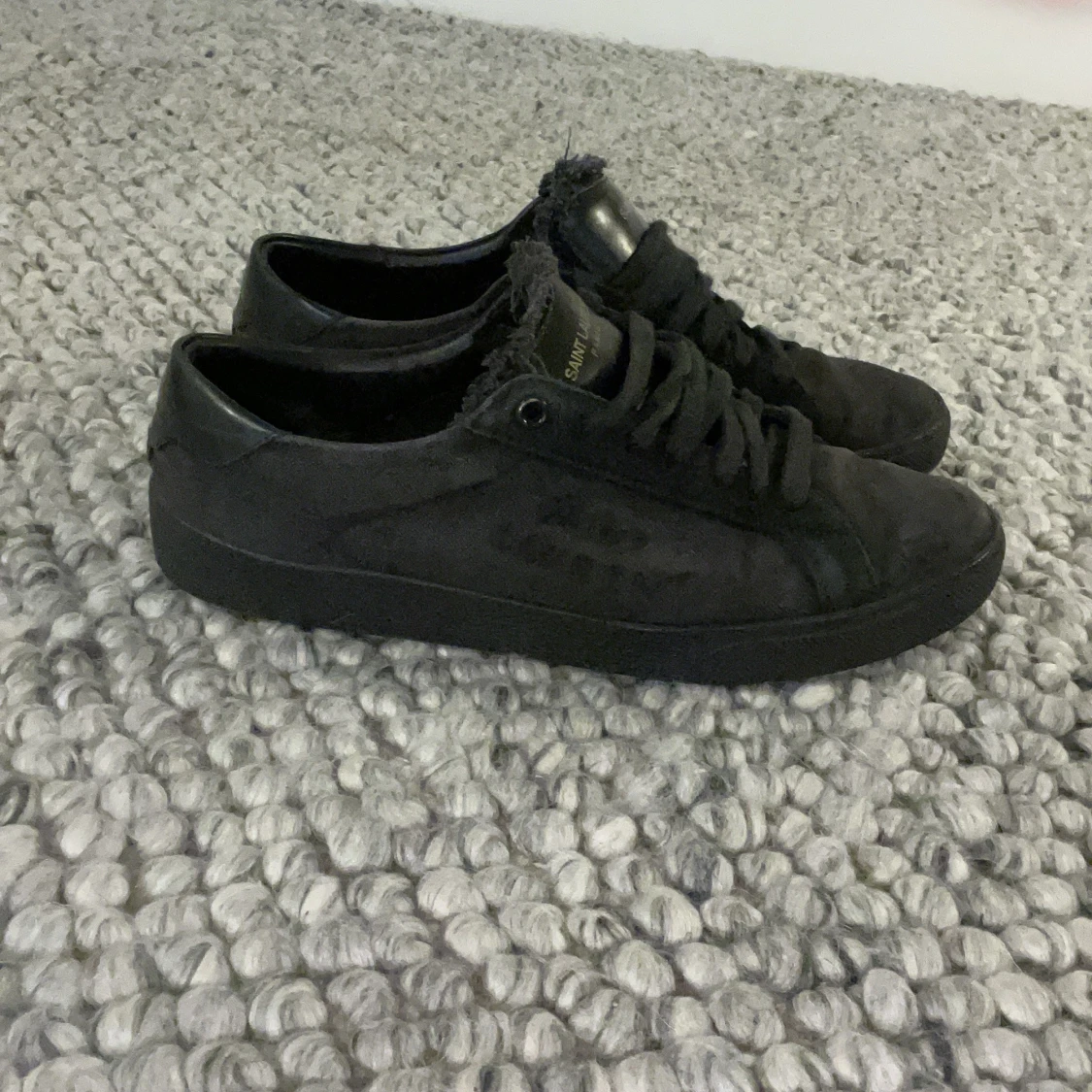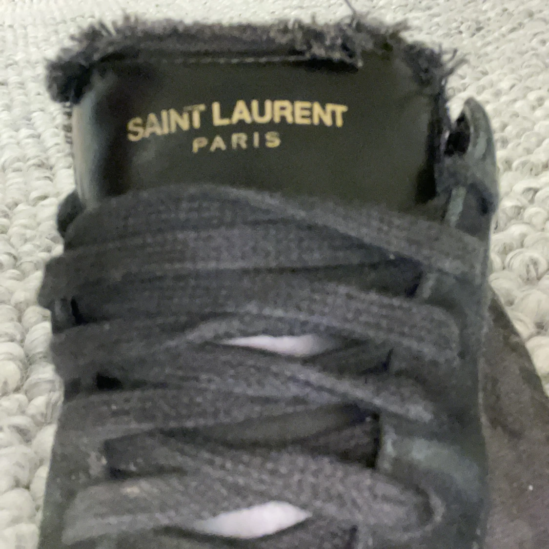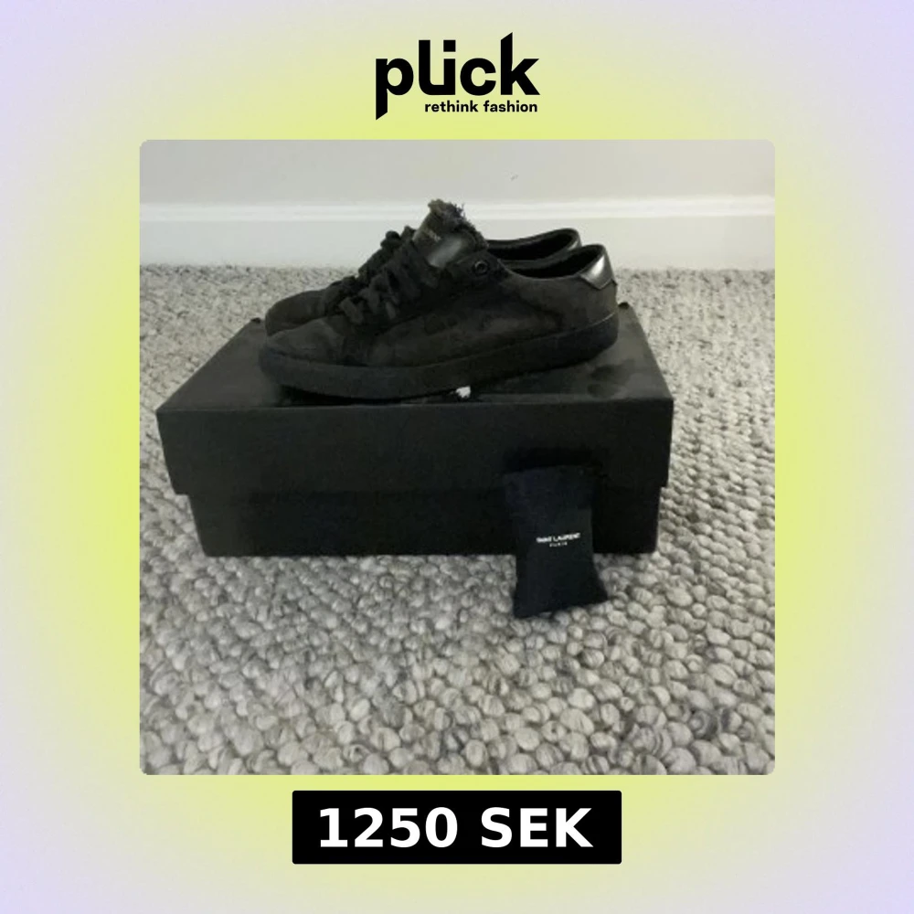 Svarta Saint Laurent Paris sneakers med snyggt fransad kant vid plösen och ton-i-ton logga. Skorna har rund tå, platt sula och snörning. Materialet är mocka med detaljer i skinn, vilket ger en lyxig och cool vibe. Perfekta för dig som gillar stilrena och exklusiva sneakers. Pris går att diskutera. [ skick 7,5 av 10] snöre är tyvär lite sönder följer med påse till skosnöre och box är storlek för 40 akter som 41. Bara att höra av sig vid frågor ☺️ dom är äkta