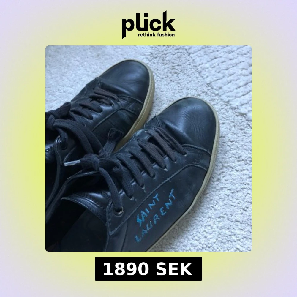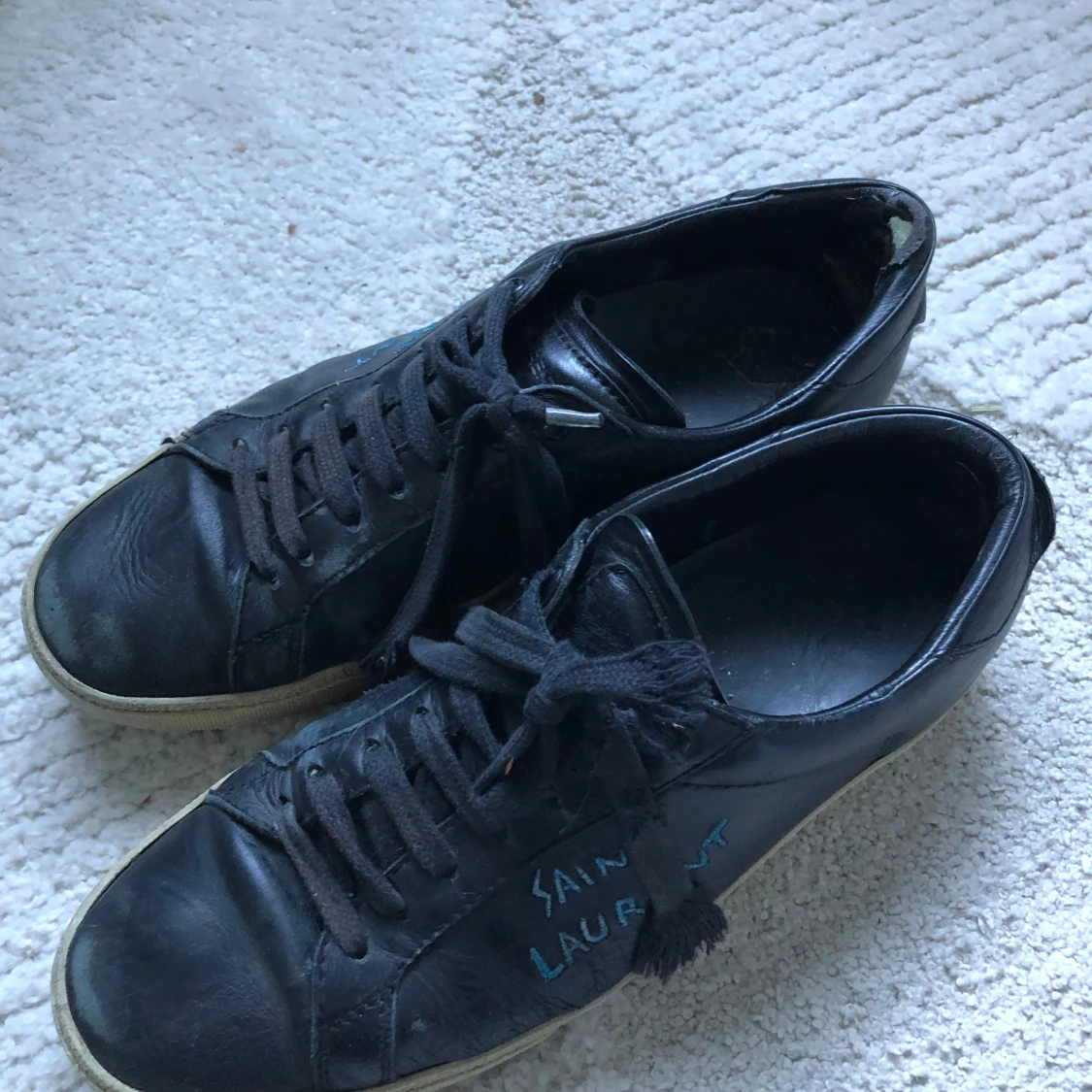 Svarta sneakers från Saint Laurent med handskriven logga i blått på sidan. Skorna har rund tå, svarta snören och en vit platt sula.