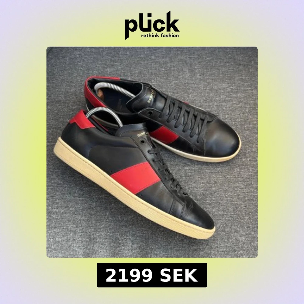 Snygga sneakers från Saint Laurent i svart skinn med röda detaljer på sidan och hälen. Beige platt sula och rund tå. Klassisk design med snörning och guldfärgad logga på plösen. Perfekt för dig som gillar stilrena och lyxiga sneakers.
