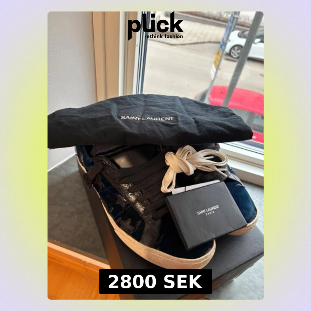 Säljer ett par sällsynta Saint Laurent sneakers i mörkblå sammet med svarta stjärnor och svarta snören. Skorna har vit platt sula och kommer med originalförpackning, extra vita skosnören och dustbag. Perfekt för dig som vill sticka ut med designerstil! Finns lite slitningar på mockan, där fram och på sidorna!