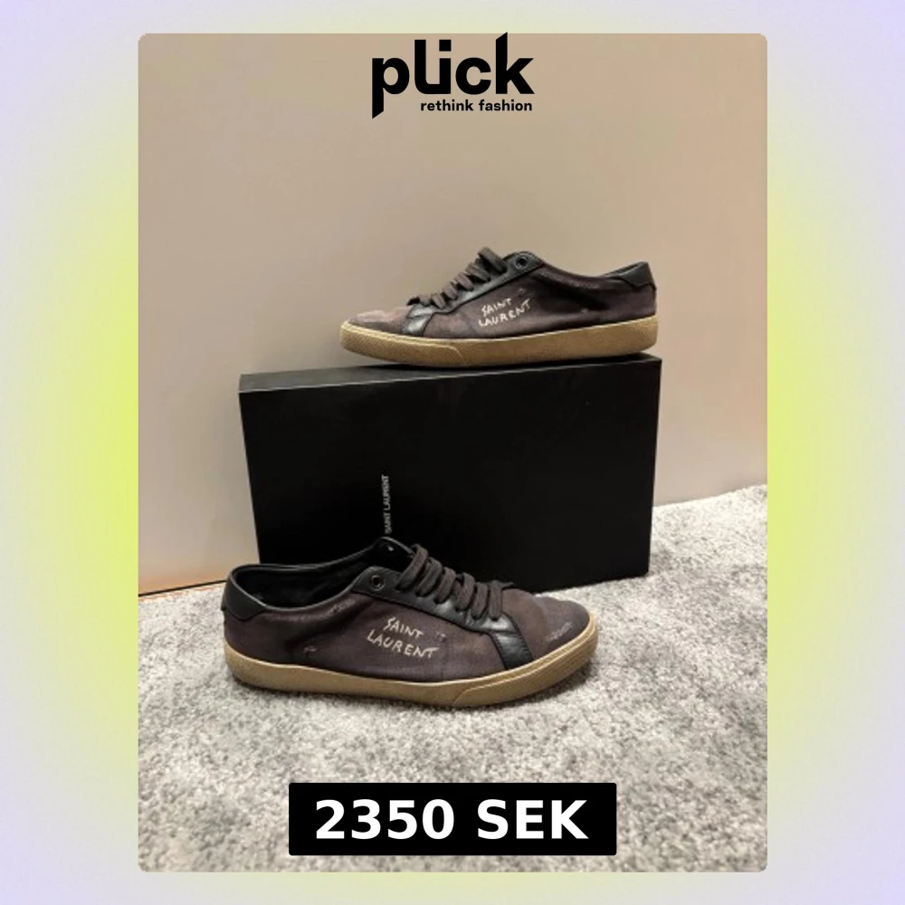 Säljer ett par svarta Saint Laurent sneakers med beige sula och handskriven logga på sidan. Skorna har snörning, rund tå och detaljer i svart skinn längs kanten. Ovandelen är i canvas och insidan är fodrad med skinn för extra komfort. Perfekt för dig som gillar stilrena designer. Jag är första ägaren av skorna och har orginalkvitto. Kan mötas upp Danderyd. Skriv för fler bilder ☺️☺️