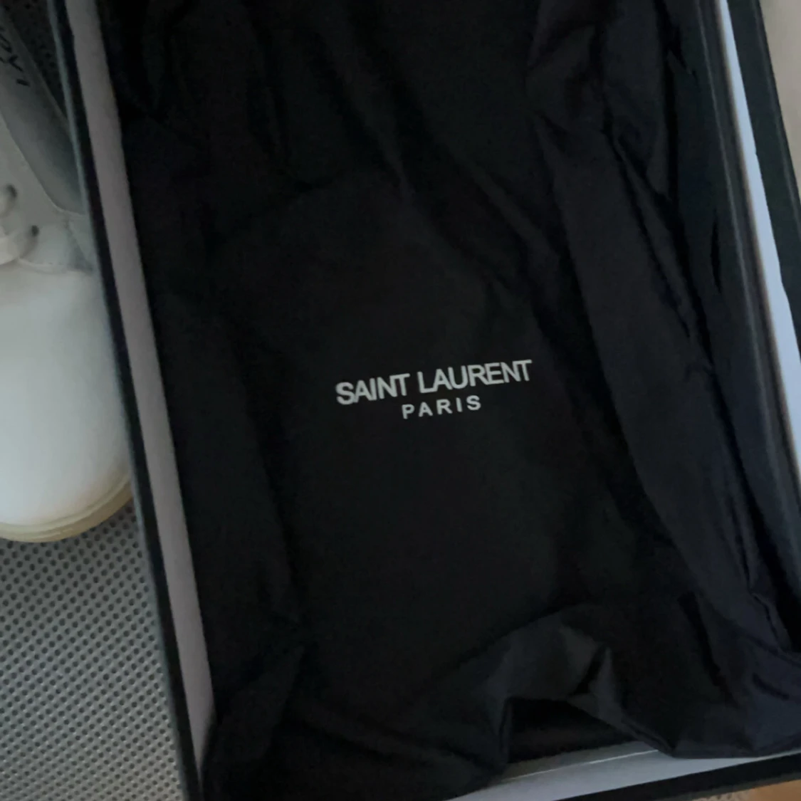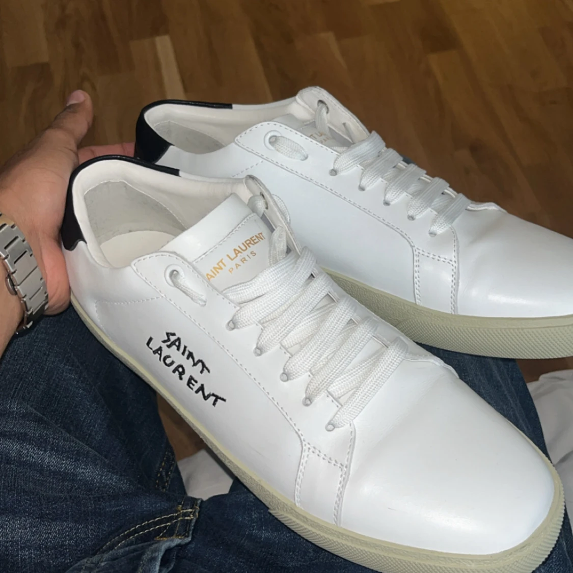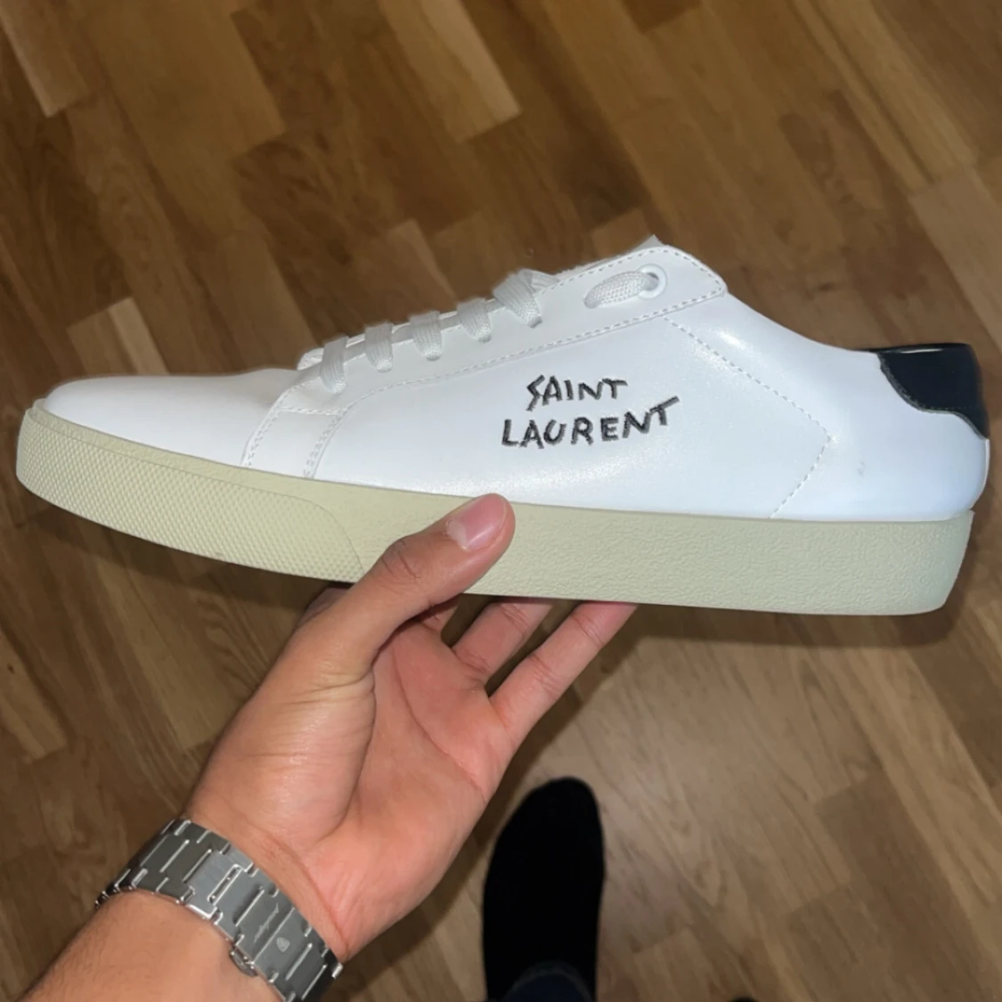 Snygga vita sneakers från Saint Laurent med svart detalj på hälen och handskriven logga på sidan. Skorna är i slätt skinn med vit snörning och krämfärgad sula. Perfekta för dig som gillar stilrena och exklusiva sneakers med en touch av lyx. Använd fåtal gånger, går att förhandla.