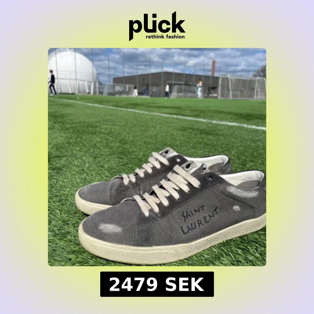 Säljer ett par svarta sneakers från Saint Laurent med vit sula och vita snören. Skorna har en sliten look med synliga slitningar och Saint Laurent-logga på sidan. Perfekta för dig som gillar en avslappnad och trendig stil.