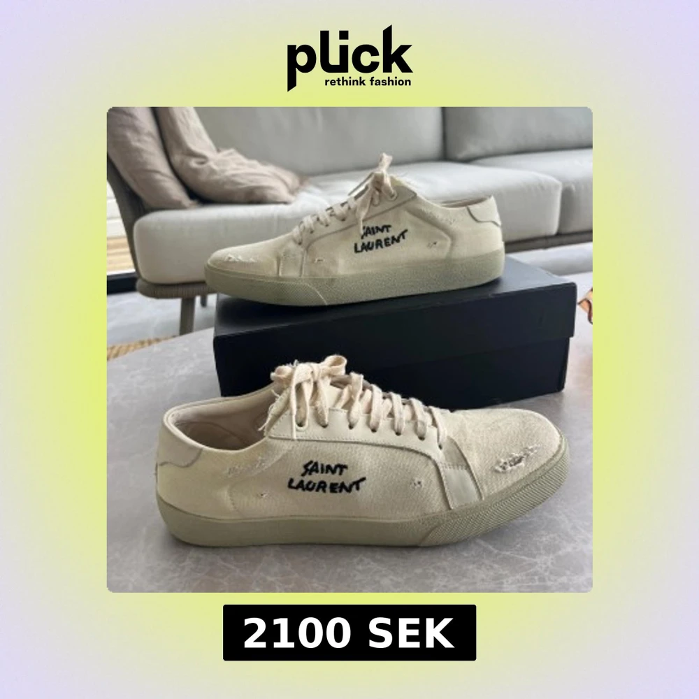 Snygga beige sneakers från Saint Laurent i canvas med handskriven logga på sidan. Skorna har snörning, platt sula och slitna detaljer för en cool, avslappnad look. Perfekta för dig som gillar streetstyle och exklusiva märken.