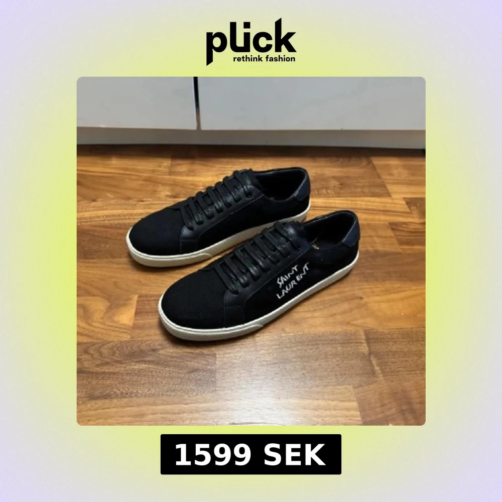 Snygga svarta sneakers från Saint Laurent med vit sula och handskriven logga på sidan. Skorna har klassisk rund tå, snörning och är tillverkade i en mix av canvas och skinn för en stilren look. Perfekta för dig som gillar minimalistisk design med exklusiv känsla.
