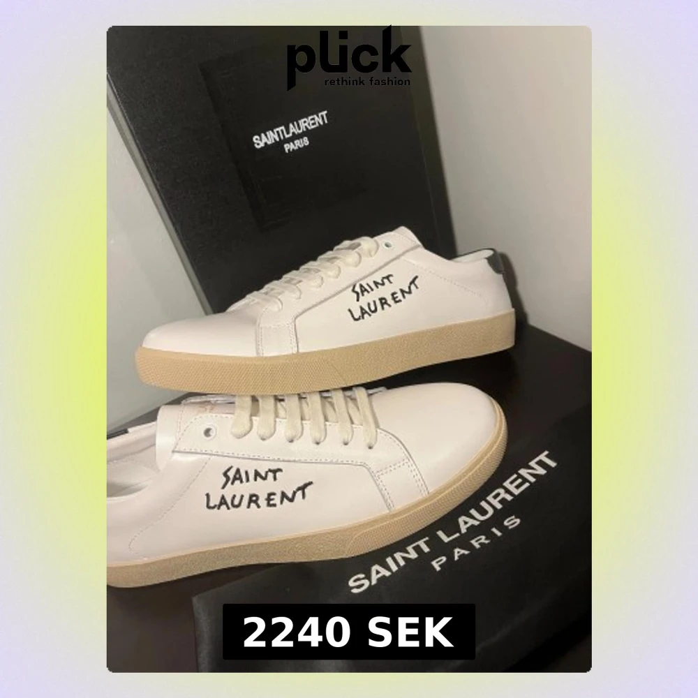 Snygga vita sneakers från Saint Laurent i skinn med handskriven logga på sidan. Skorna har beige platt sula, snörning och svart detalj på hälen. Perfekta för dig som gillar stilrena och exklusiva sneakers med en twist.