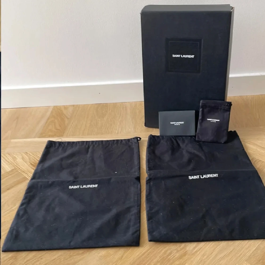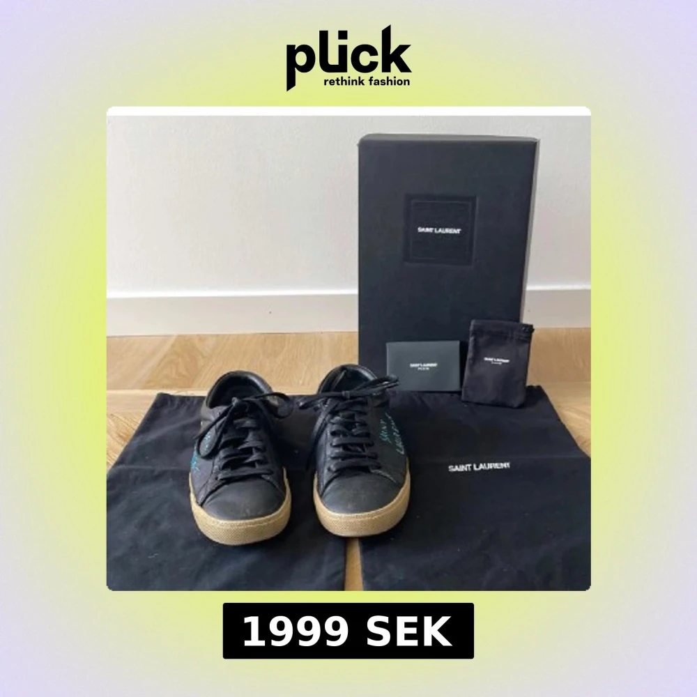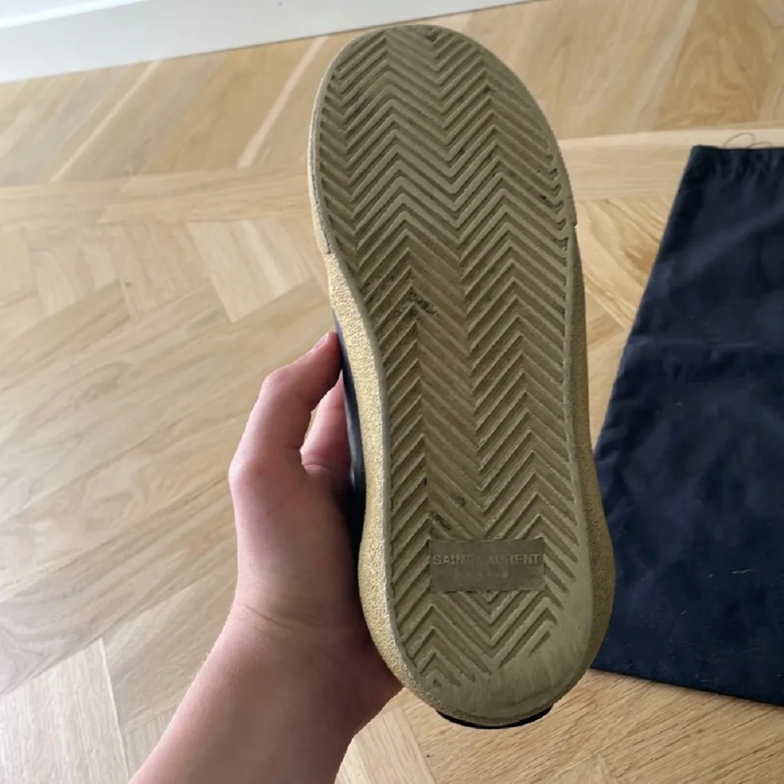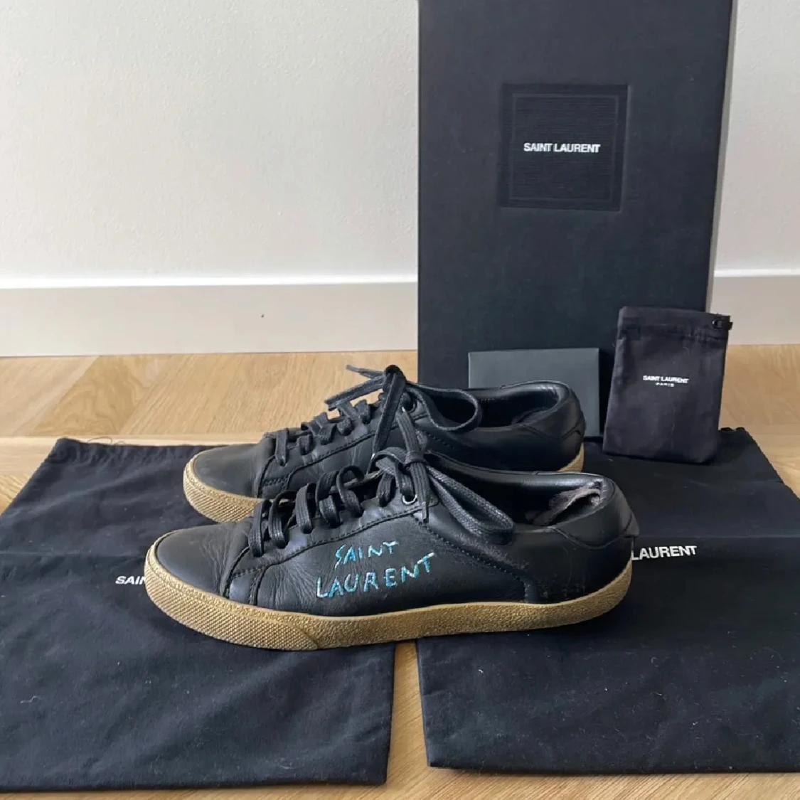 Svarta sneakers från Saint Laurent i skinn med handskriven logga i blått på sidan. Klassisk låg modell med snörning och beige gummisula. Snygg och stilren design som passar till det mesta. Levereras med originalkartong och dustbags.
