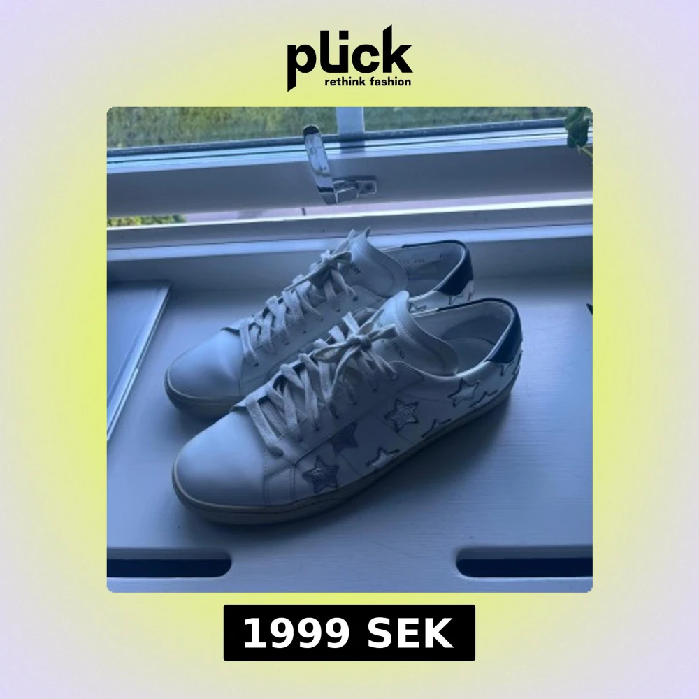 Säljer ett par vita sneakers från Saint Laurent med silverfärgade stjärnor på sidorna och svart detalj vid hälen. Skorna är köpa på vestiare, digitalt kvitto finns!