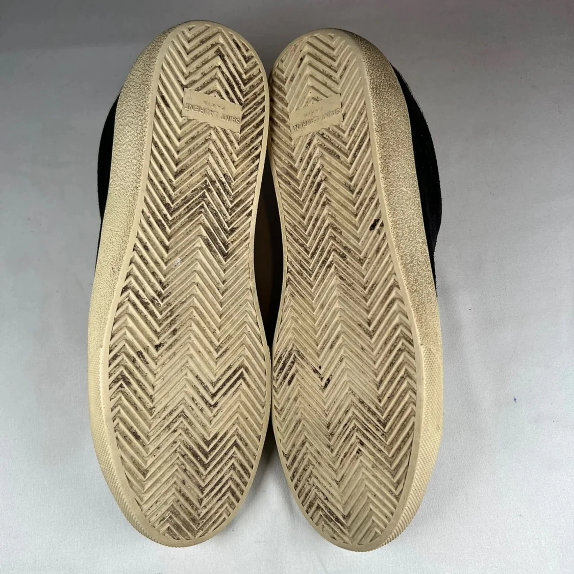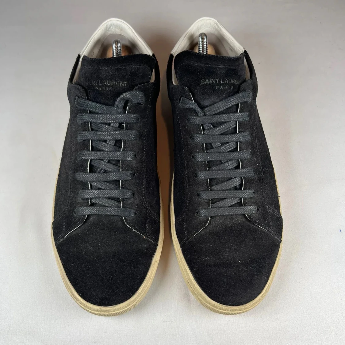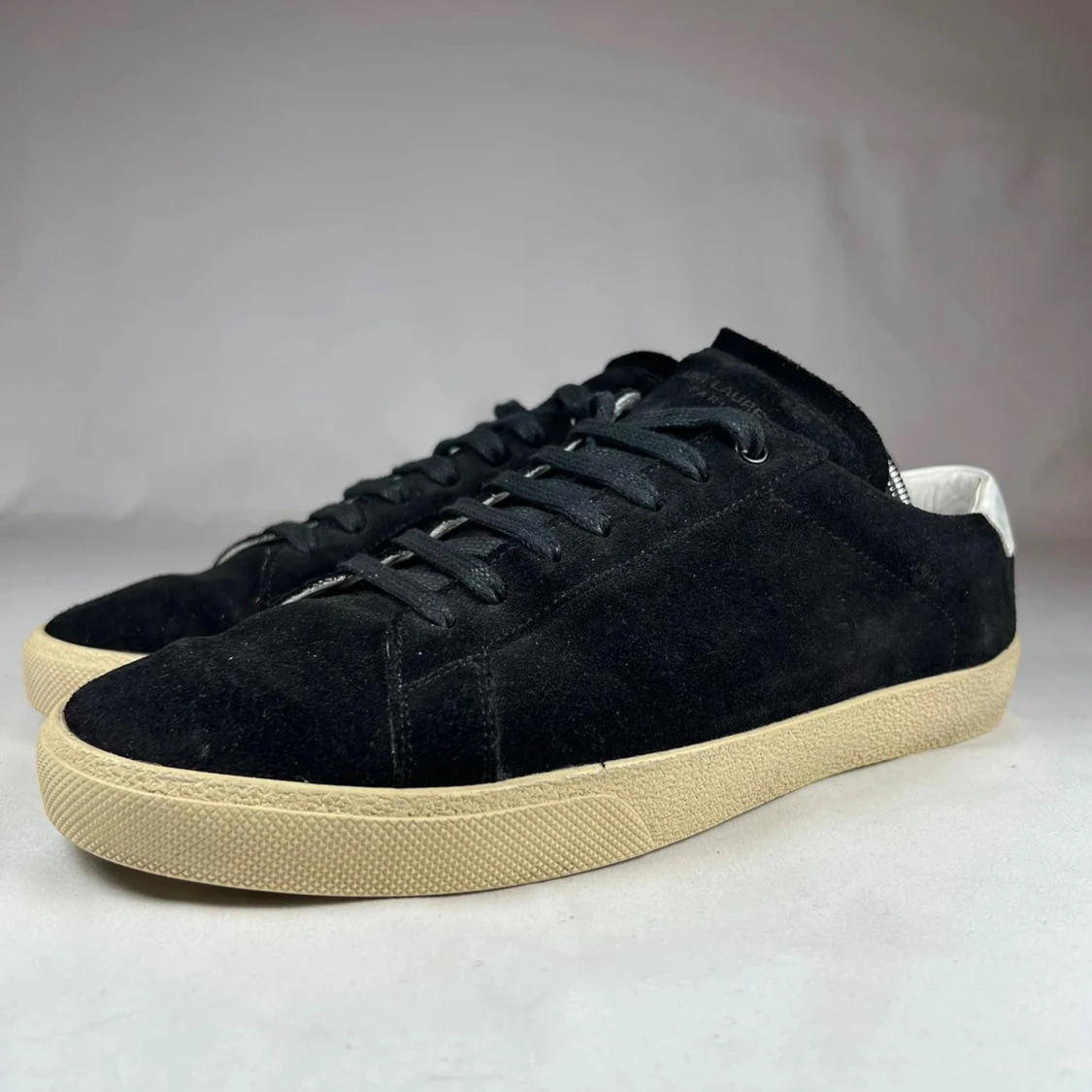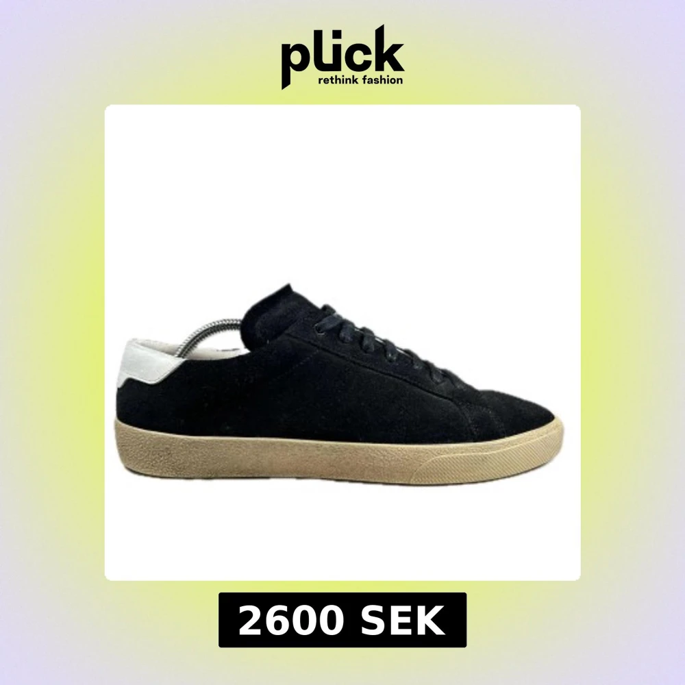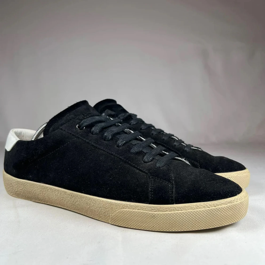 Svarta sneakers från Saint Laurent i mjuk mocka med beige platt gummisula och vit detalj på hälen. Klassisk låg modell med rund tå och snörning framtill. Perfekt för dig som gillar stilrena och lyxiga skor med minimalistisk vibe. Pris kan diskuteras privat!