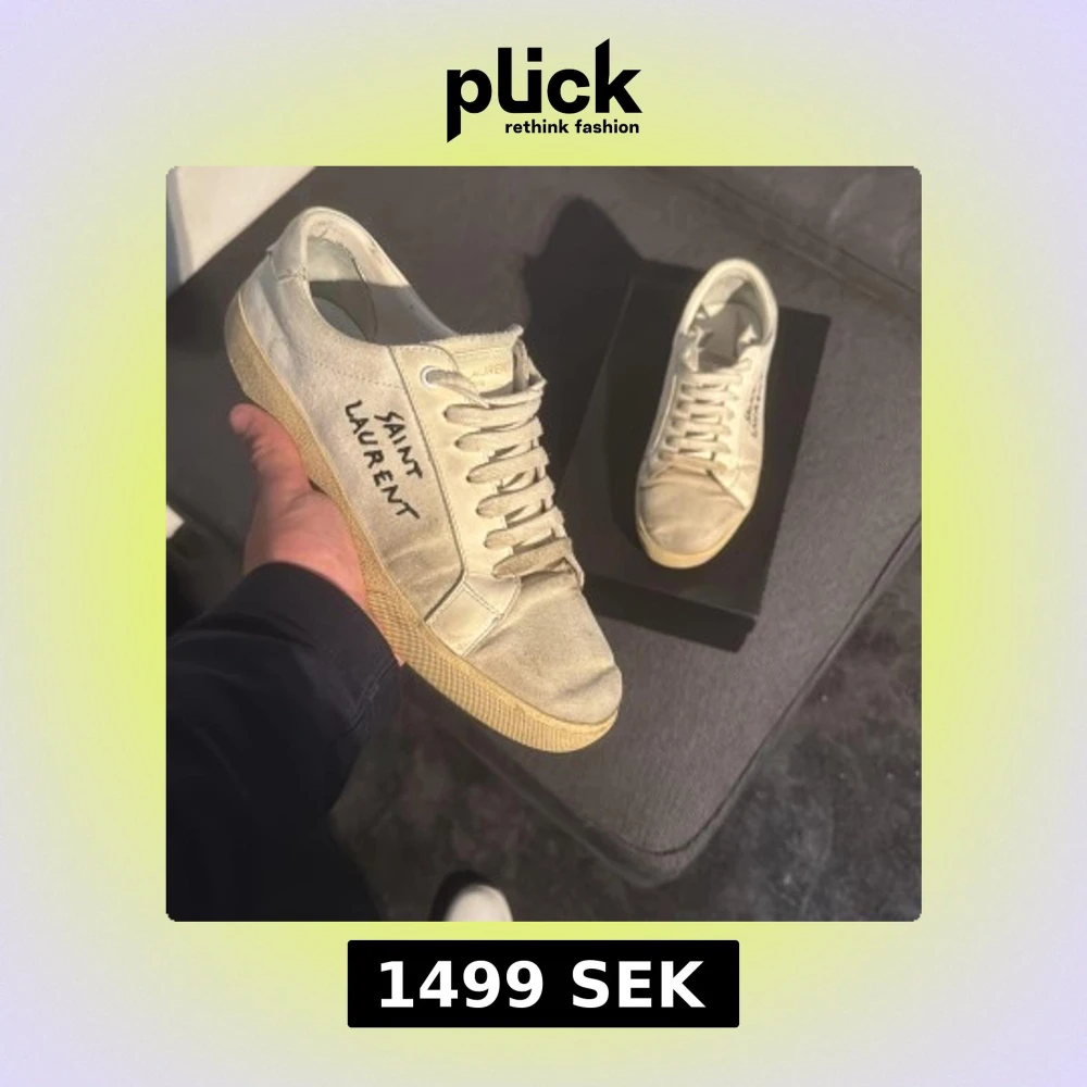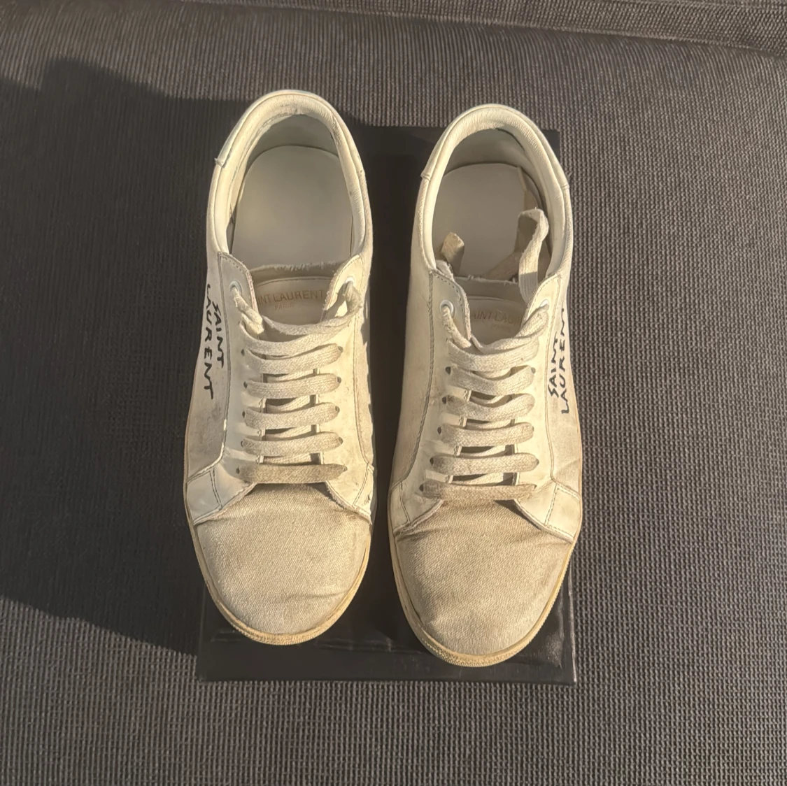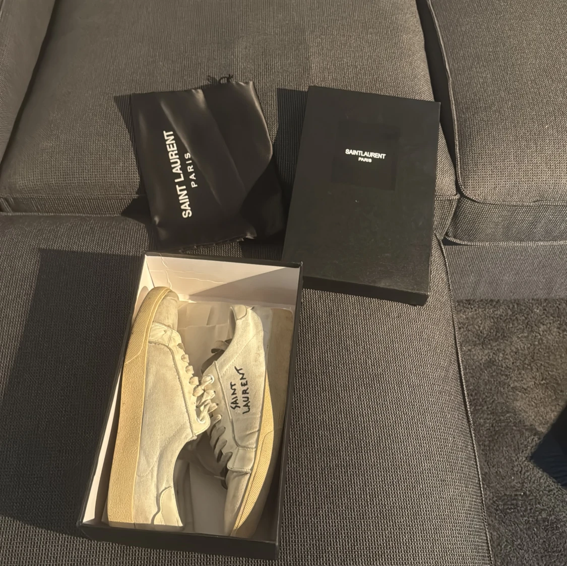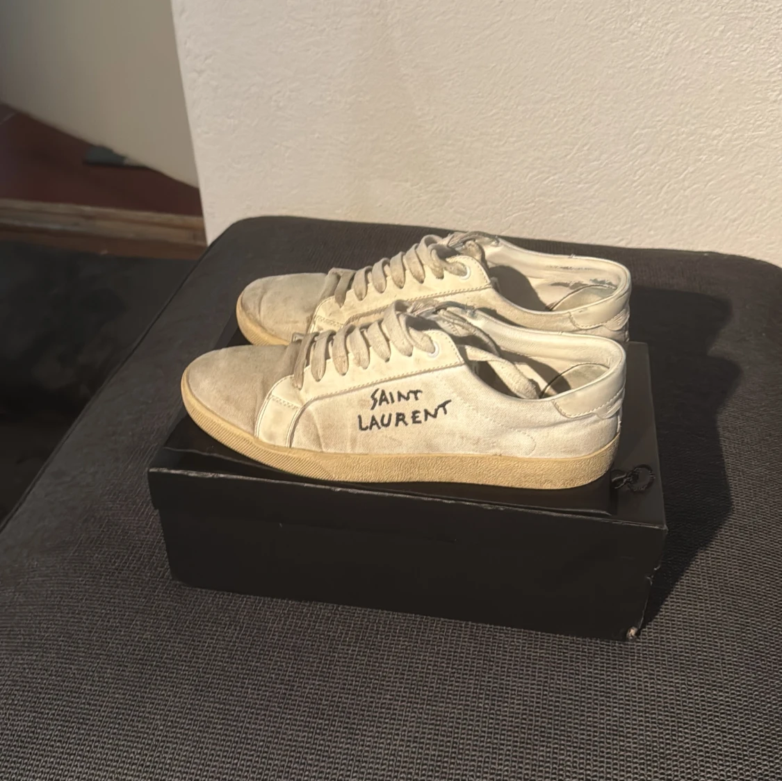 Säljer nu mina gamla snygga sneakers från Saint Laurent de dem inte passar mig så bra längre. Skorna har andvänds ganska mycket och har därför tydliga tecken på andvändning. Inga defekter dock. Strl 43 men kan funka på ngn som har 42