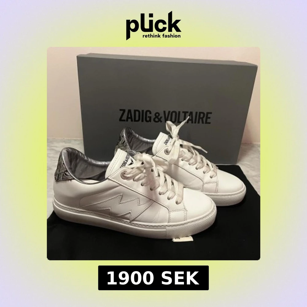 Snygga vita sneakers från Zadig & Voltaire i skinn med coolt blixtdetalj på sidan och broderad häl i svart med inslag av rosa, grått och grönt. Skorna har snörning och silvrig insida som ger en extra touch. Perfekta för dig som vill sticka ut med stilrena detaljer.