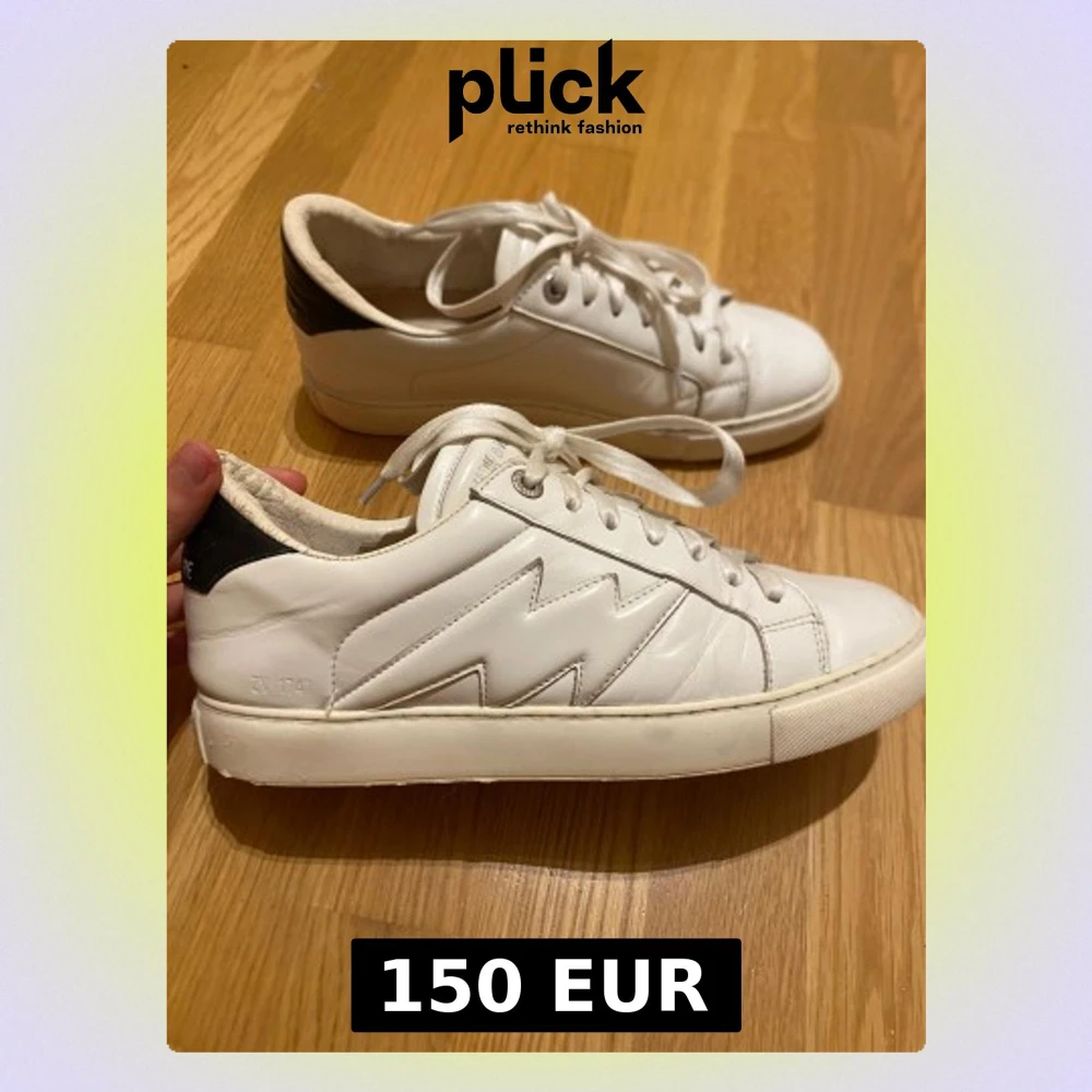 Snygga vita sneakers från Zadig & Voltaire med svart hälparti och coolt blixtdetalj på sidan. Skorna har rund tå, platt sula och snörning framtill. Tillverkade i skinn för en lyxig känsla och stilren look. Perfekta för dig som gillar minimalistisk design med en twist. Lite använda på insidan men nya på utsidan (se sista bilden)