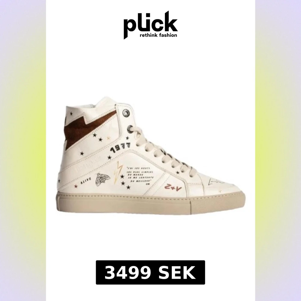Snygga vita höga sneakers från Zadig & Voltaire med handritade detaljer, stjärnor och textprint. Skorna har bruna blixtdetaljer i mocka på baksidan, snörning och platt sula.
